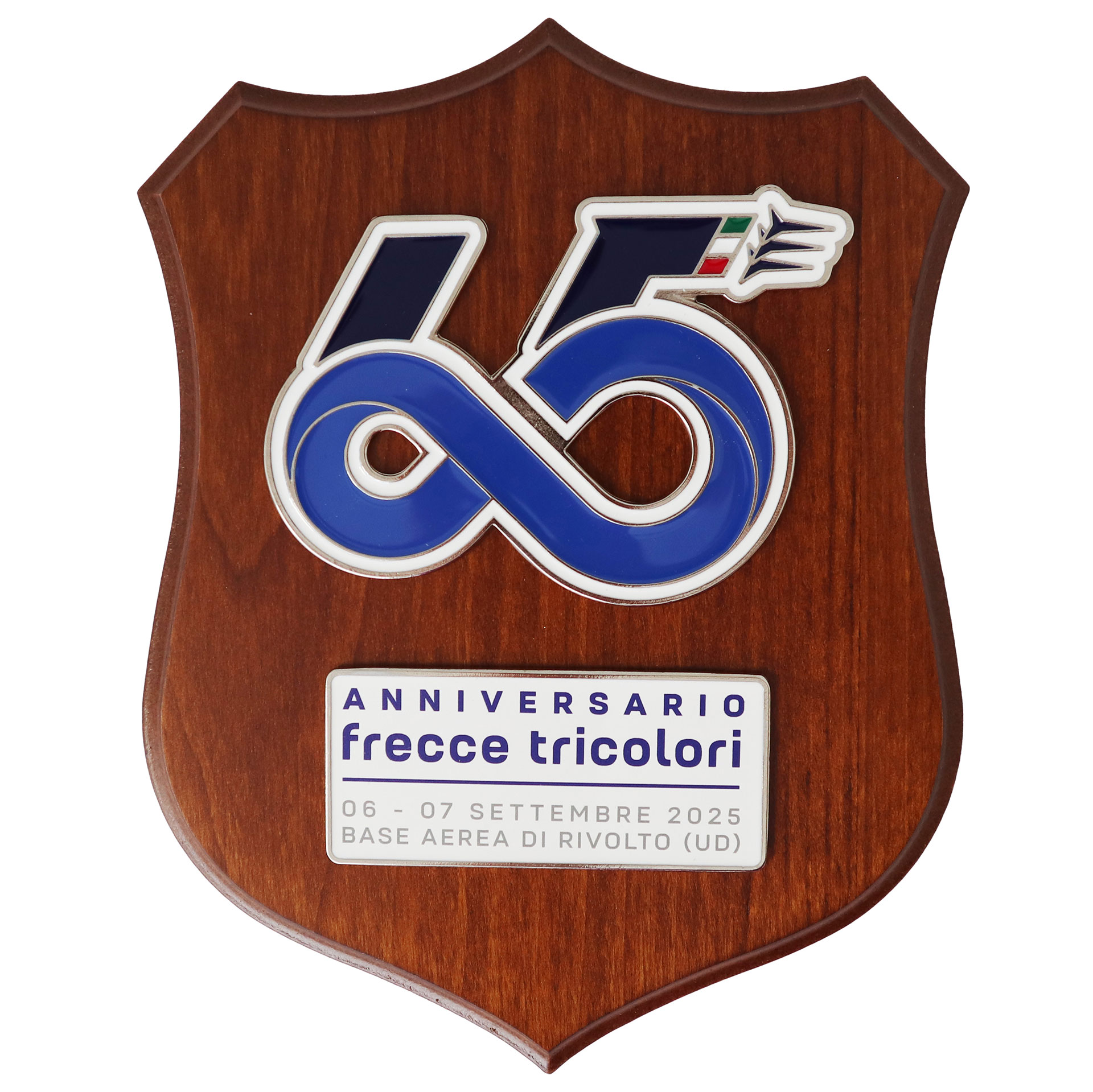 Scopri il crest dedicato al 65° anniversario delle Frecce Tricolori, perfetto per valorizzare ambienti ufficiali, commemorativi o come elegante gadget ricordo di Rivolto 2025. Montato su una solida base di legno naturale di 22,5 × 17,5 cm, combina robustezza e stile e presenta la piastra con il dettaglio dell'Airshow del 6 e 7 settembre 2025 alla base aerea di Rivolto.