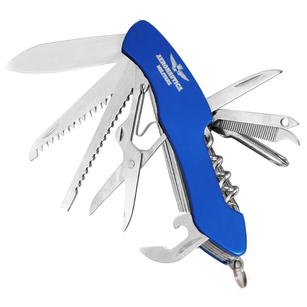 Coltellino 6,5cm; forbici, sega piccola e grande, apriscatole, apribottiglie, cavatappi, lametta, lesina, fa-buchi, cacciavite
