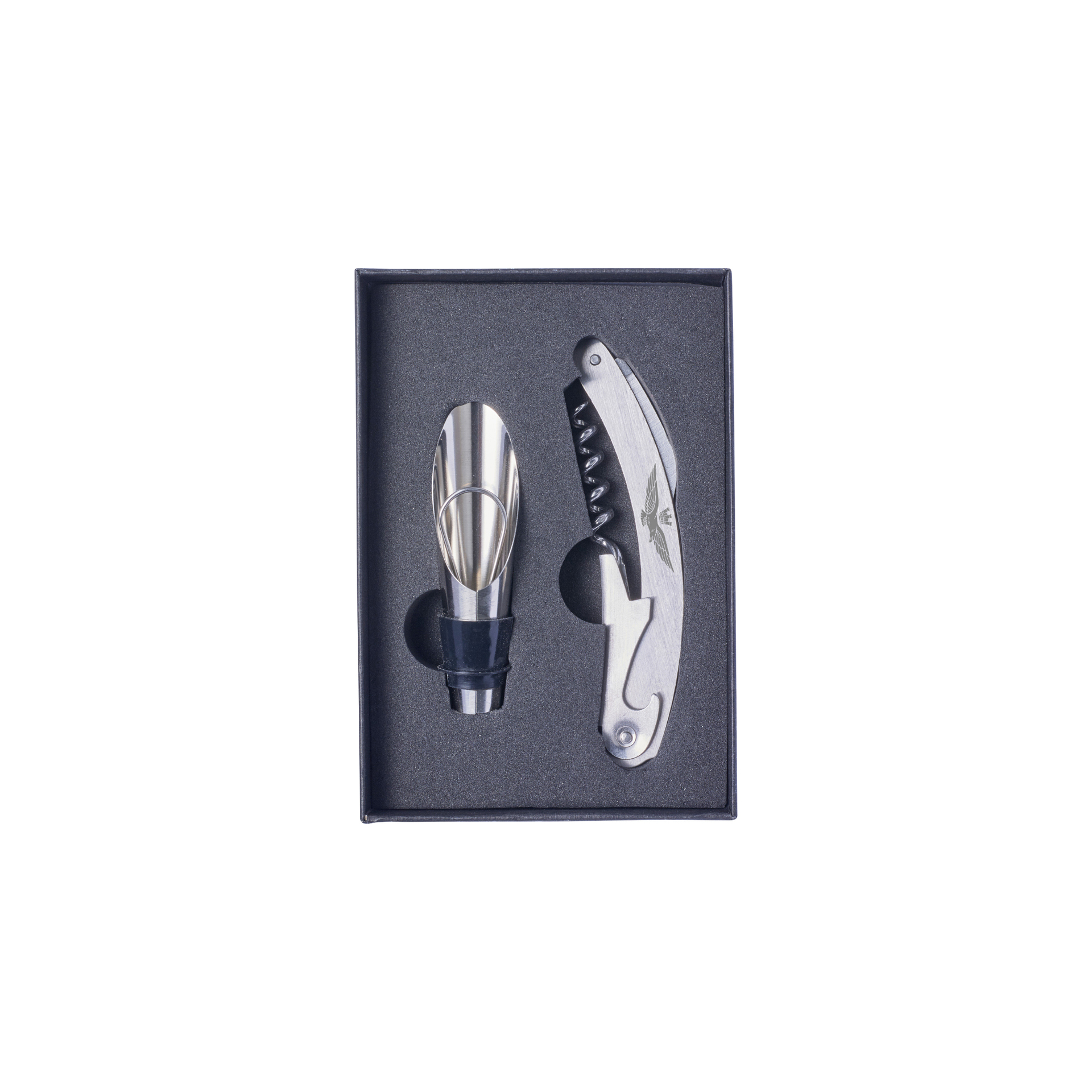 SET DA VINO IN DUE ACCESSSORI IN ACCIAIO INOSSIDABILE, COMPOSTO DA CAVATAPPI PER CAMERIERE E TAPPO PER BOTTIGLIA CON BECCUCCIO VERSATORE DIMENSIONI 10,2 X 14,1 X 3,0 CM