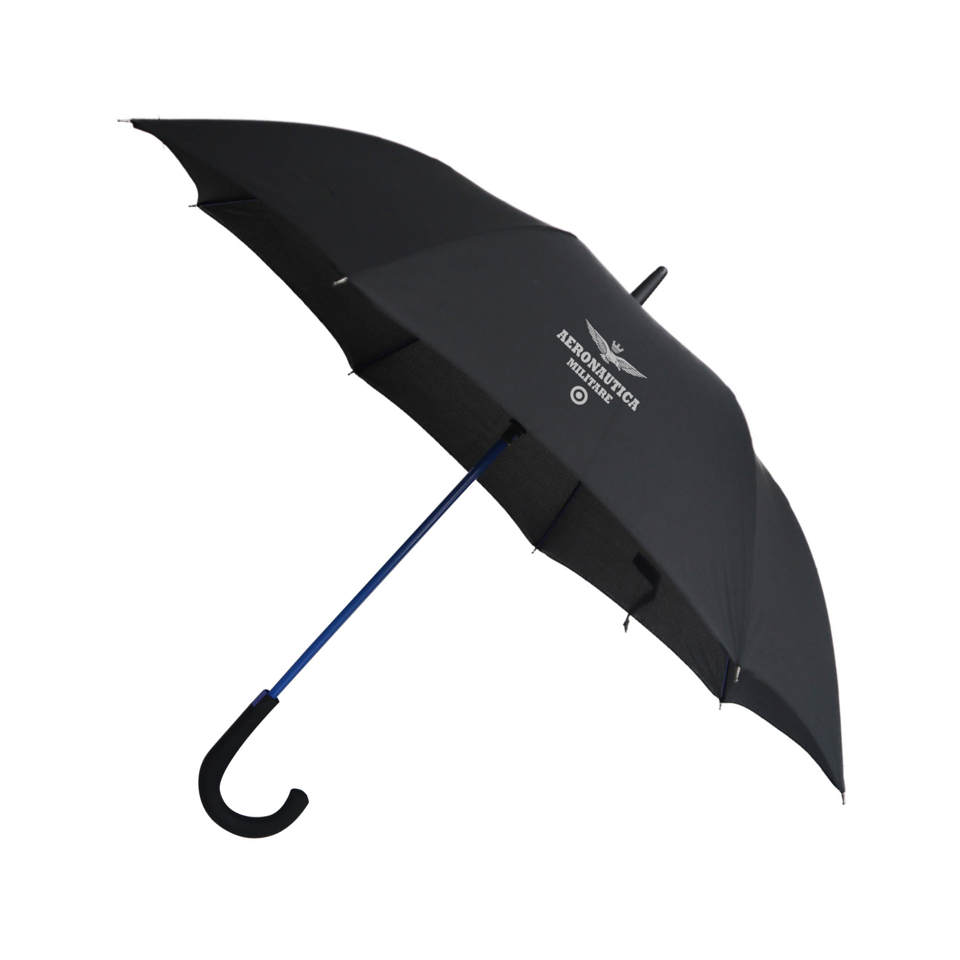OMBRELLO CLASSICO AUTOMATICO, STECCHE IN METALLO, RAGGI IN FIBRA, MANICO CURVO GOMMATO CON PULSANTE BLU, LACCETTO CON CHIUSURA A STRAPPO 76.5