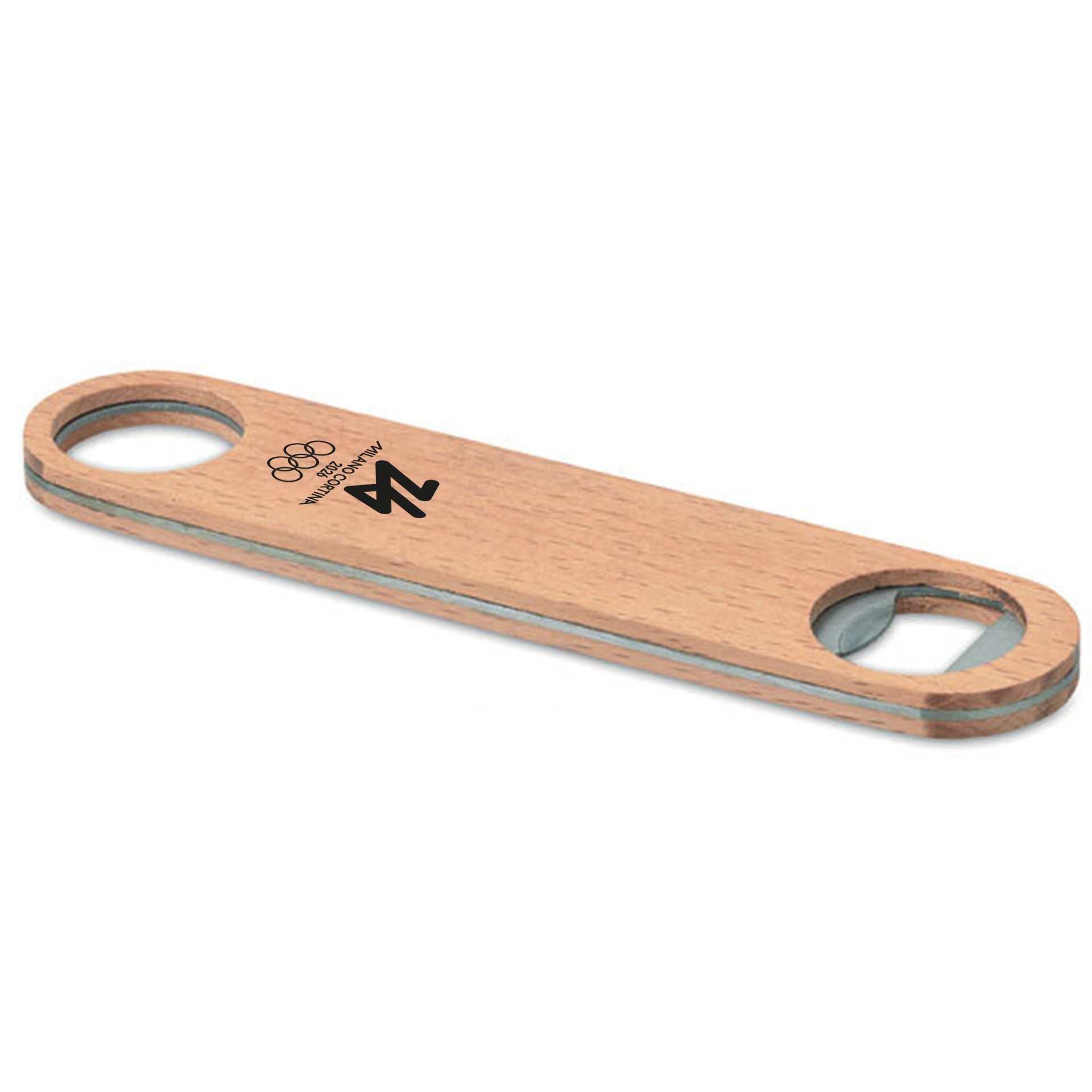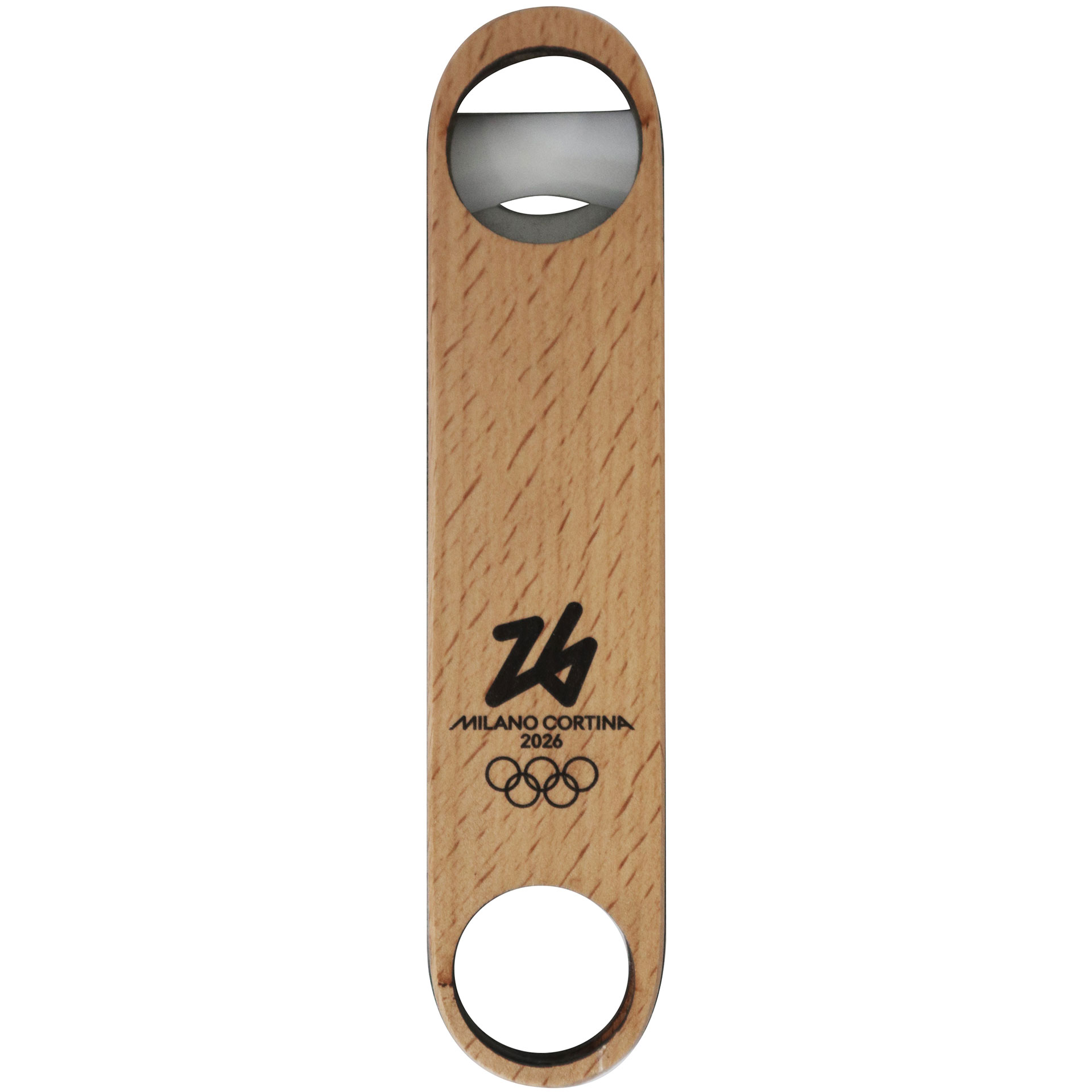 APRIBOTTIGLIE OLIMPIADI MILANO CORTINA 2026 IN ACCIAIO INOSSIDABILE CON SUPERFICIE IN LEGNO DIMENSIONE 17,5X3,5X0,8 CM LOGO OLYMPIC EMBLEMA MONOCROMATICO NERO 5 CERCHI SU FONDO LEGNO