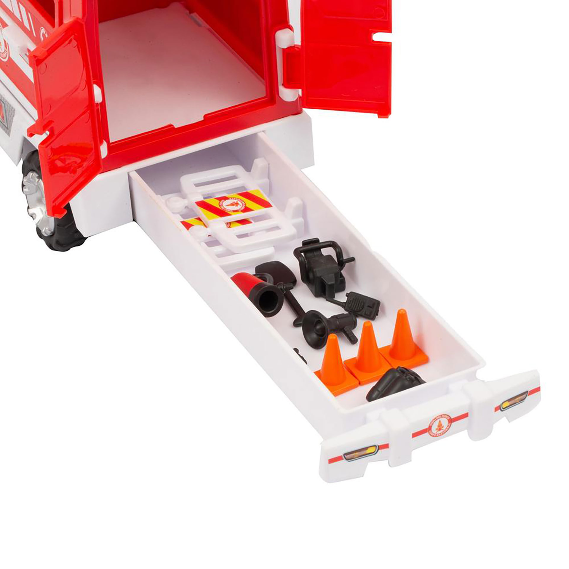 AUTOBOTTE CON LIVREA ORIGINALE A RUOTA LIBERA VIGILI DEL FUOCO, CON SCALA ESTENSIBILE, CON SPORTELLI APRIBILI E SPAZI PER POSIZIONARE GLI ACCESSORI, INCLUSO PERSONAGGIO ARTICOLATO CON EQUIPAGGIAMENTO PER EMERGENZE