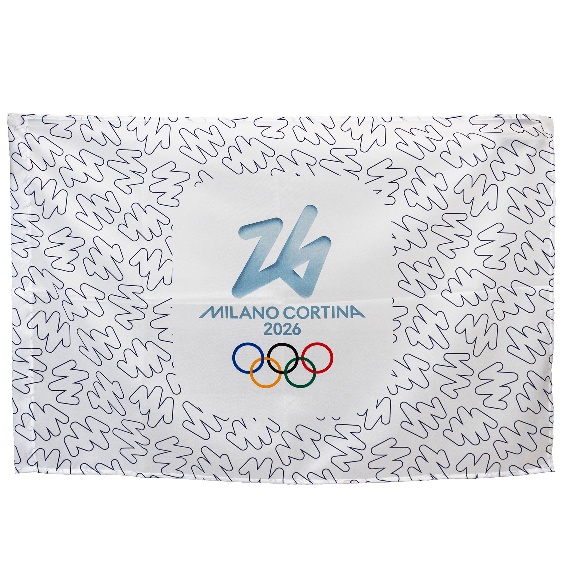 BANDIERA OLIMPIADI MILANO CORTINA 2026 IN POLIESTERE 150X100CM SENZA ASTA FONDO SIGN BIANCO LOGO OLYMPIC EMBLEMA 5 CERCHI COLORATO