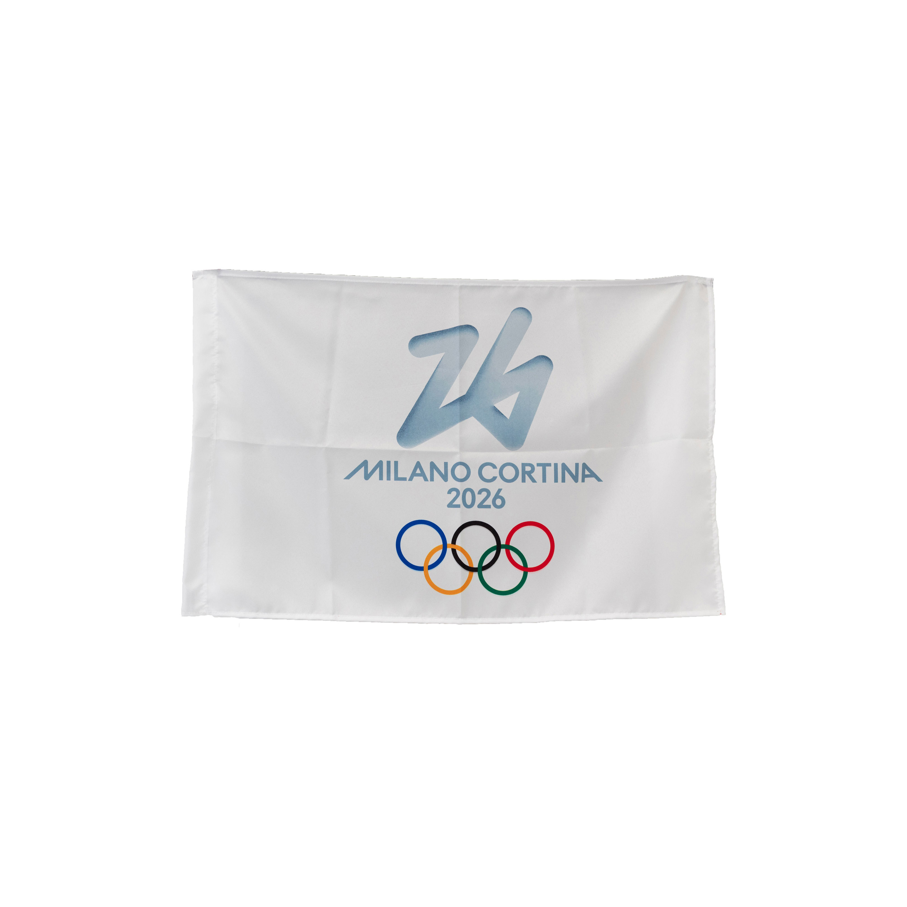 BANDIERA OLIMPIADI MILANO CORTINA 2026 IN POLIESTERE 70X50CM SENZA ASTA FONDO BIANCO LOGO OLYMPIC EMBLEMA 5 CERCHI COLORATO