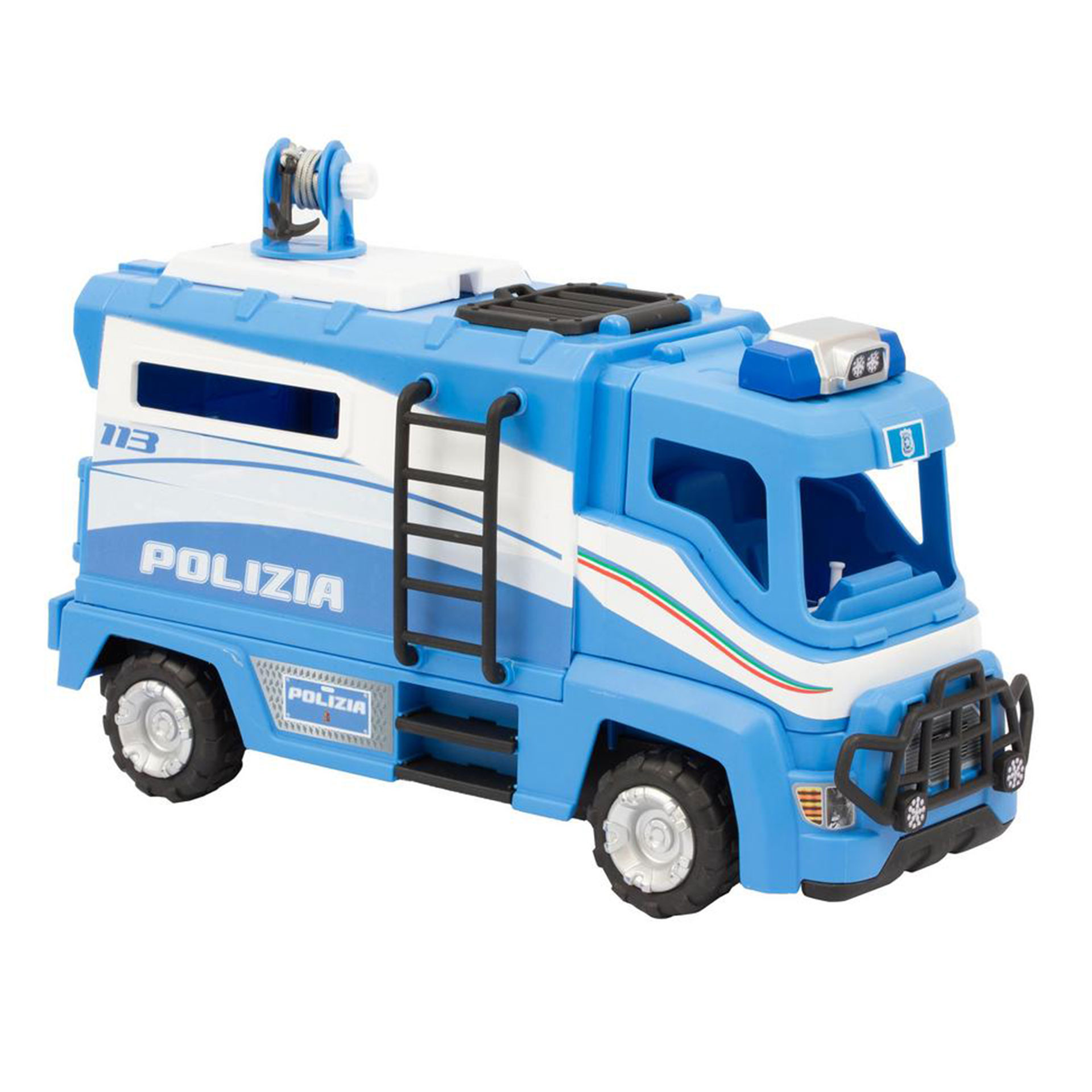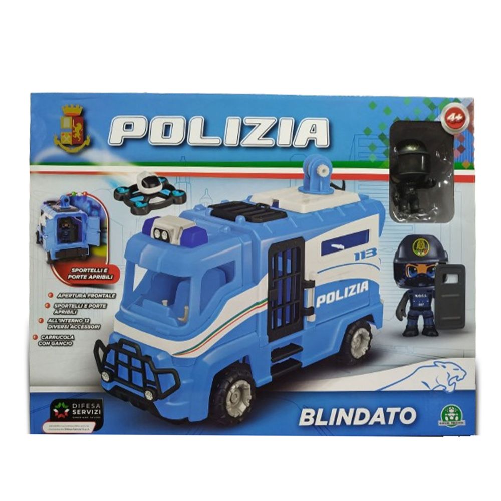 BLINDATO CON LIVREA ORIGINALE A RUOTA LIBERA CON CELLA, ABITACOLO CON SPORTELLI APRIBILI E SPAZIO PER PERSONAGGIO, CASSETTO PER RIPORRE ACCESSORI, PERSONAGGIO IN DIVISA UFFICIALE POLIZIA E ACCESSORI PERSONALIZZATI