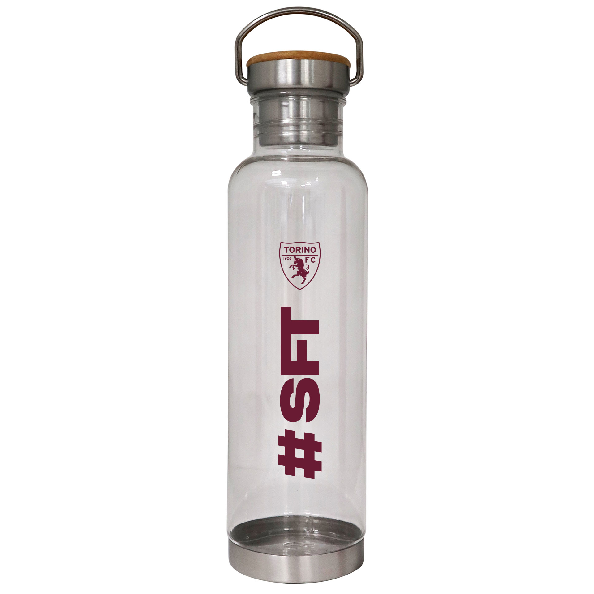 BORRACCIA IN TRITAN TRASPARENTE TAPPO IN ACCIAIO E BAMBOO CON SCRITTA SF