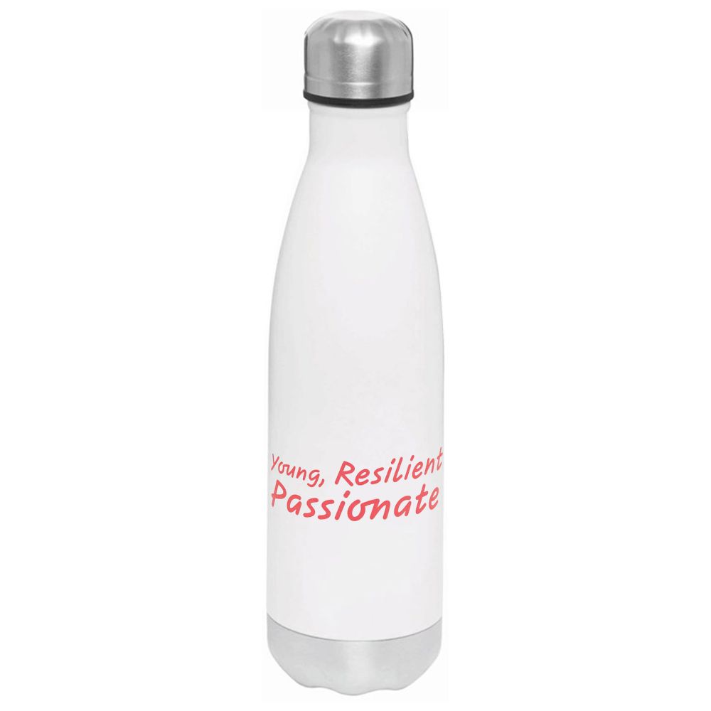 BORRACCIA OLIMPIADI MILANO CORTINA 2026 BIANCA IN ACCIAIO 500 ML ALTEZZA 26 CM TAPPO ARGENTO LOGO PARALYMPIC EMBLEMA COLORATO SU FONDO BIANCO CON SCRITTA YOUNG RESILIENT PASSIONATE