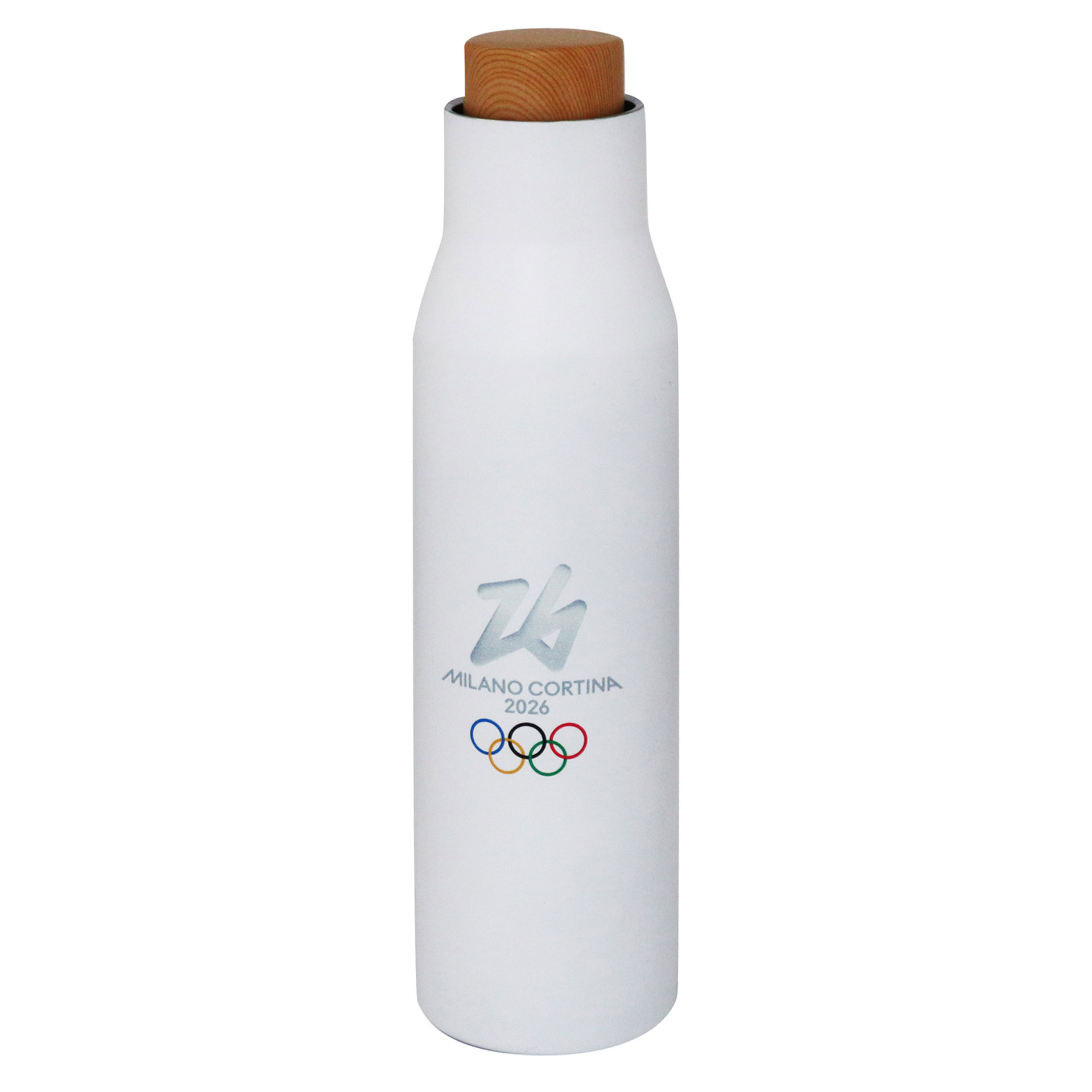 BORRACCIA OLIMPIADI MILANO CORTINA 2026 BIANCA TERMICA IN ACCIAIO INOX 304 DOPPIA PARETE TAPPO IN PLASTICA CON EFFETTO BAMB? 500 ML DIAMETRO 69 MM LOGO OLYMPIC MASCOT TINA COLORATO 5 CERCHI SU FONDO BIANCO THE FLO