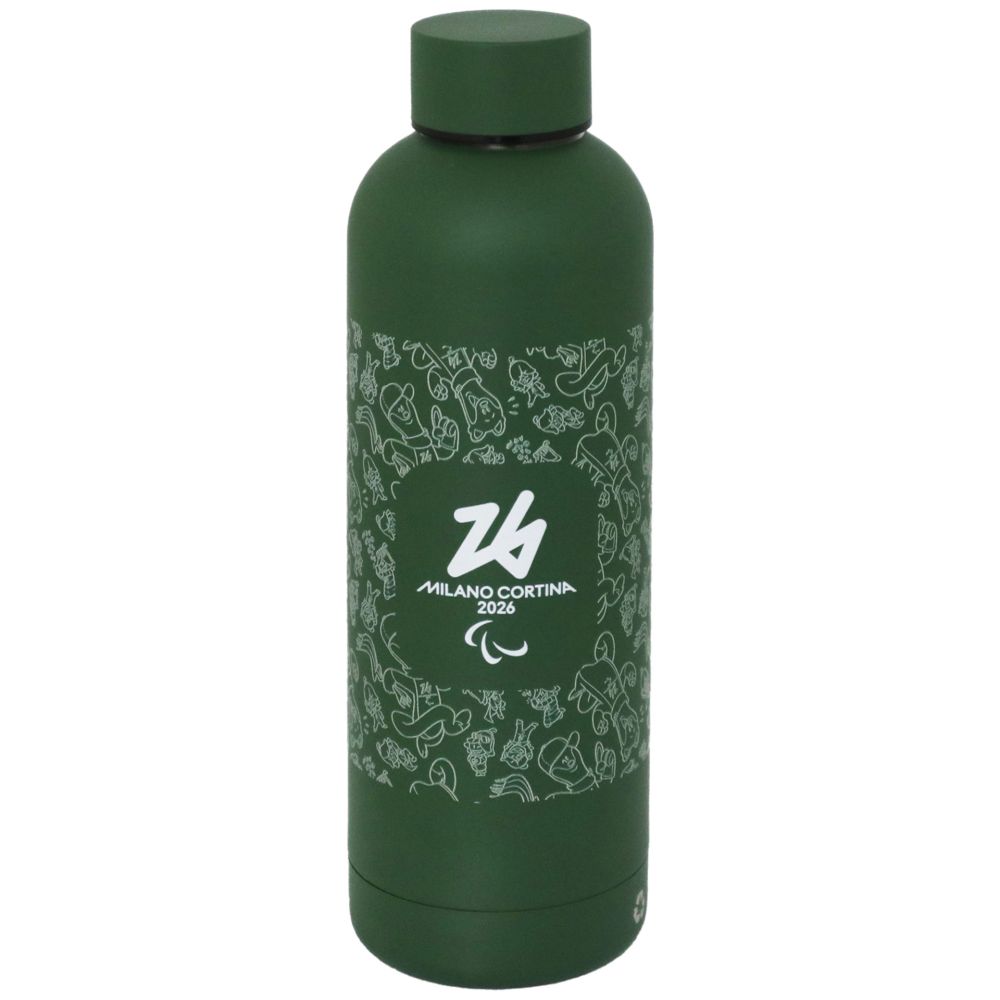 BORRACCIA OLIMPIADI MILANO CORTINA 2026 VERDE TERMICA IN ACCIAIO INOX 304 RICICLATO DOPPIA PARETE FINITURA OPACA 500 ML DIAMETRO 70 MM LOGO PARALYMPIC MASCOT MILO MONOCROMATICO SU FONDO TEXTURE VERDE MANTIENE 8 ORE IL CALDO E 12 ORE IL FREDDO