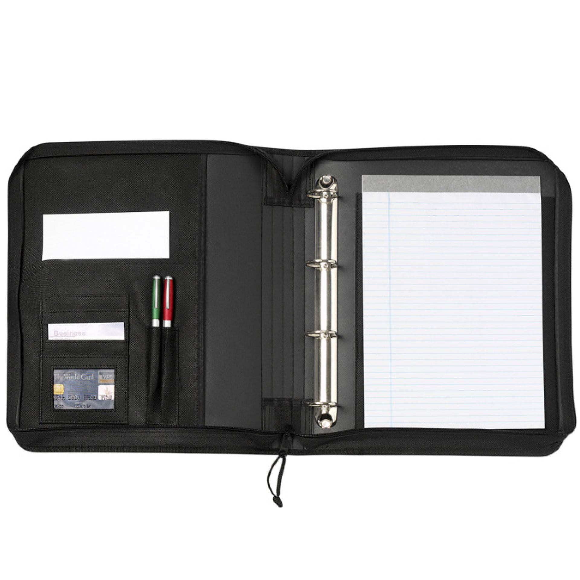CARTELLA PORTABLOCCO FORMATO A4, CON MECCANISMO A 4 ANELLI, SEZIONE PORTADOCUMENTI, CHIUSURA LAMPO, SCOMPARTI PER PENNA (NON INCLUSE), BLOCCO INCLUSO, IN POLIESTERE 600 D DIMENSIONE 35,5 X 31,0 X 6,4 CM