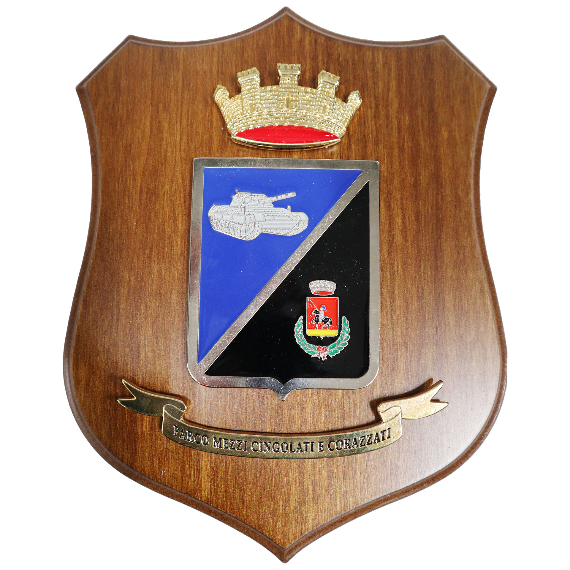 CREST IN METALLO SMALTATO BASE LEGNO 22,5X17,5CM PARCO MEZZI CINGOLATI E CORAZZATI