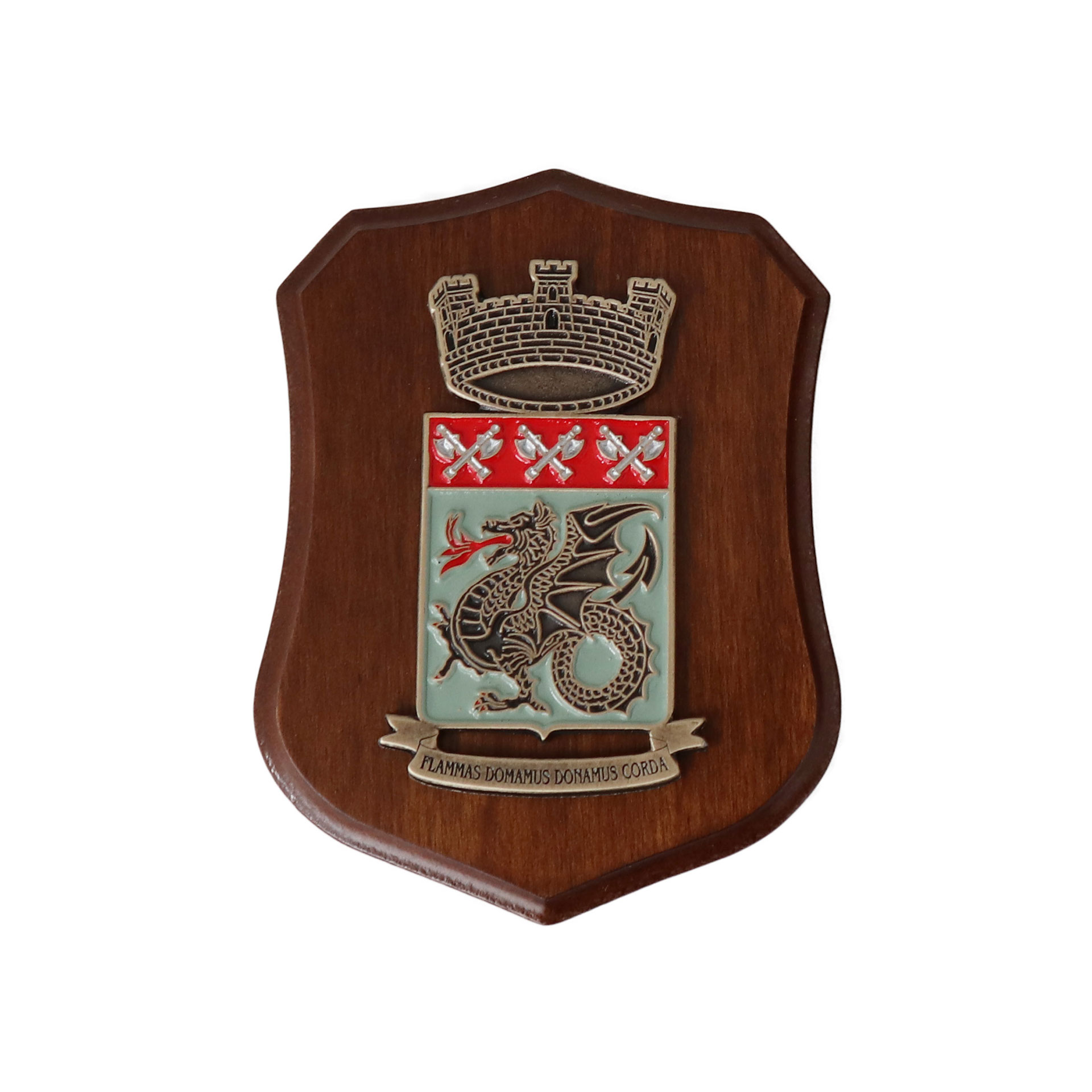 MINICREST STEMMA ARALDICO VIGILI DEL FUOCO IN METALLO E SMALTO SU BASE IN LEGNO 11,3X8,6 CM