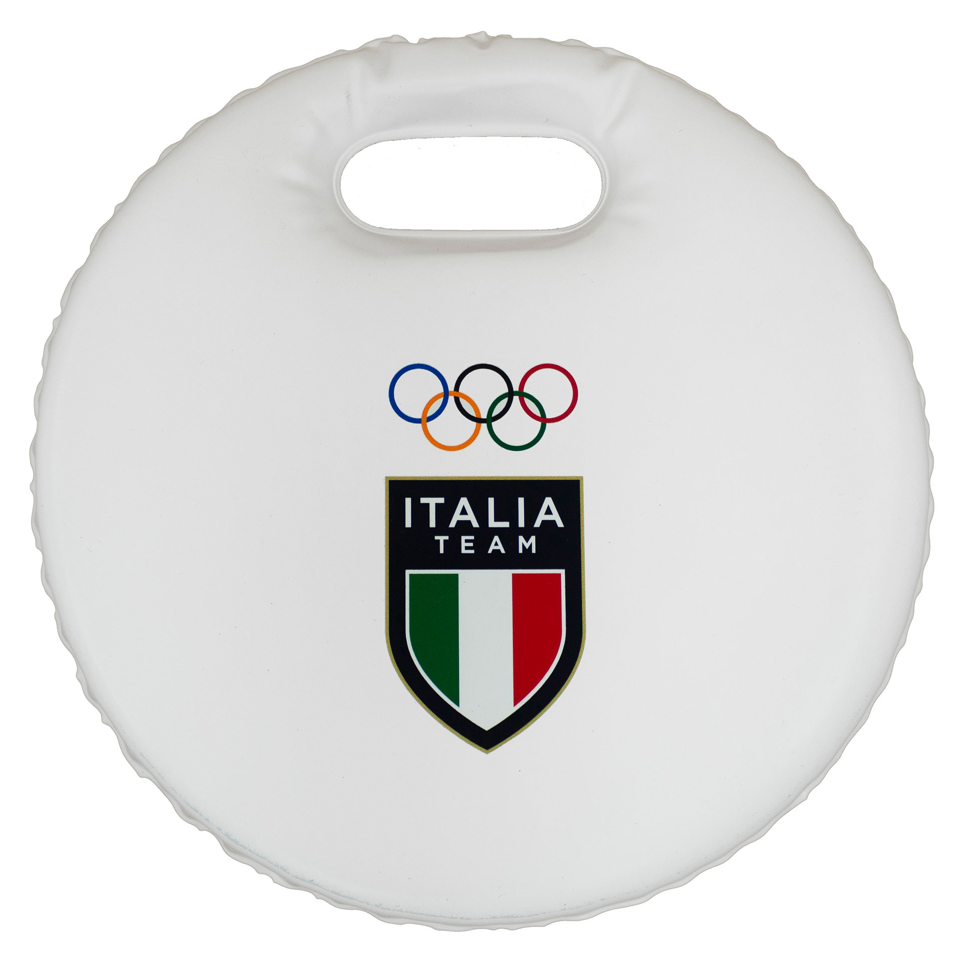 CUSCINO DA NEVE ITALIATEAM IMBOTTITO E IMPERMEABILE BIANCO DIAMETRO 29 CM LOGHI OLYMPIC EMBLEMA E SCUDO ITALIA TEAM COLORATI
