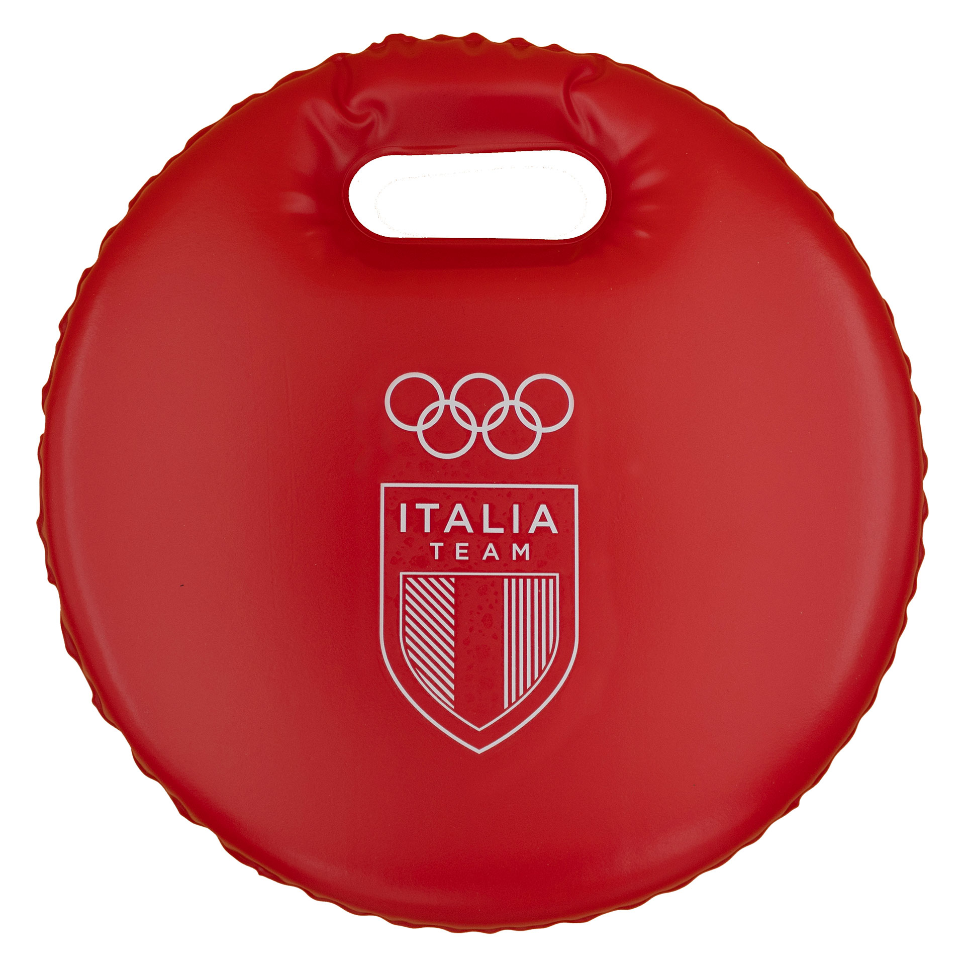 CUSCINO DA NEVE ITALIATEAM IMBOTTITO E IMPERMEABILE ROSSO DIAMETRO 29 CM LOGHI OLYMPIC EMBLEMA E SCUDO ITALIA TEAM MONOCROMATICI BIANCHI