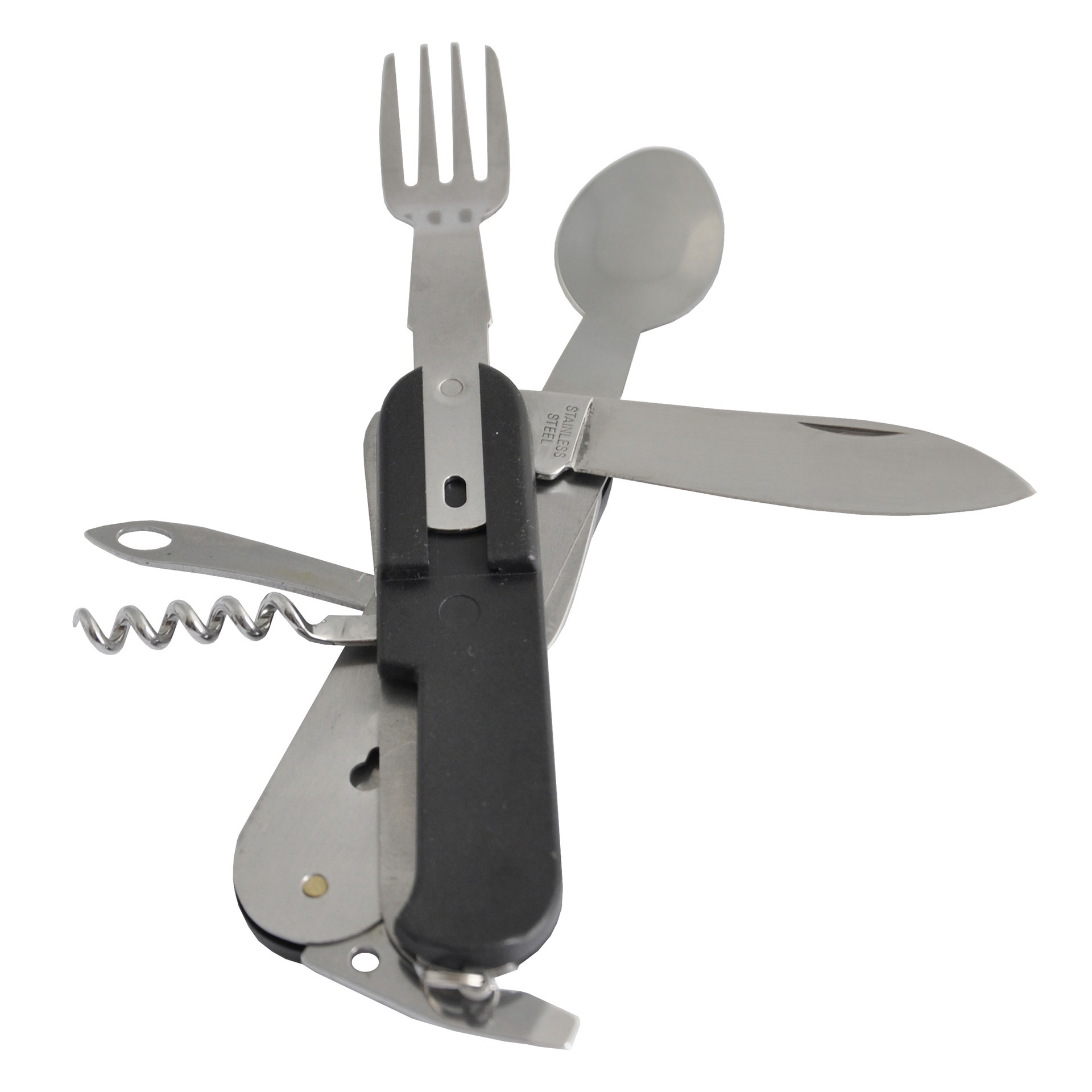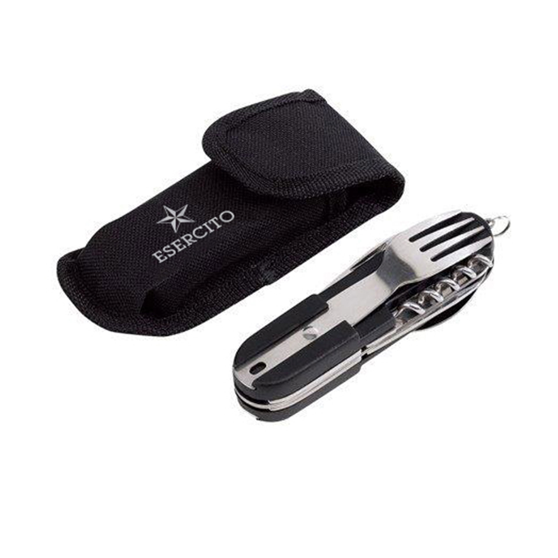 Apribottiglie multifunzione Wildlife in acciaio 7 elementi: coltello, apribottiglie, apriscatole, cavatappi, raschietto, forchetta, cucchiaio. Custodia con passante per cintura e chisura a velcro.