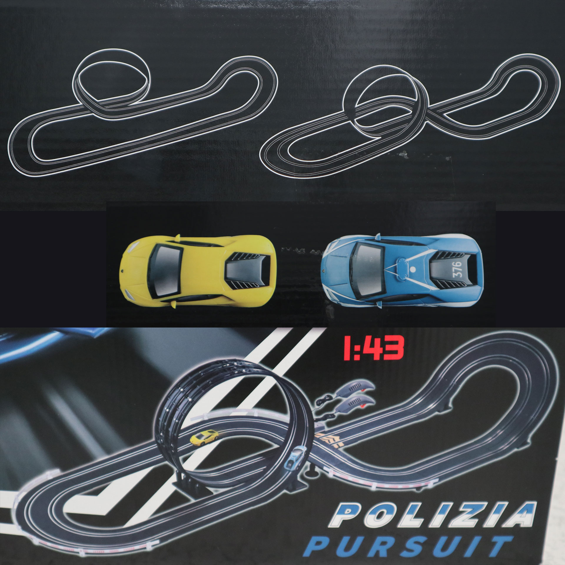 Contiene due slot car in scala 1:43, 12 curve,3 rettilinei, 1 rettilineo con contagiri, 1 alimentatore 230-12V, 2 spazzole, 2 pneumatici,2 controller,1 cavo usb, due supporti ponte, 30 piccoli accessori