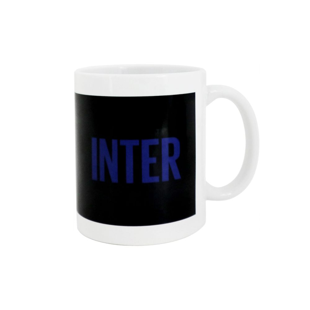Tazza mug in ceramica a forma cilindrica con logo ufficiale Inter su fondo nero.