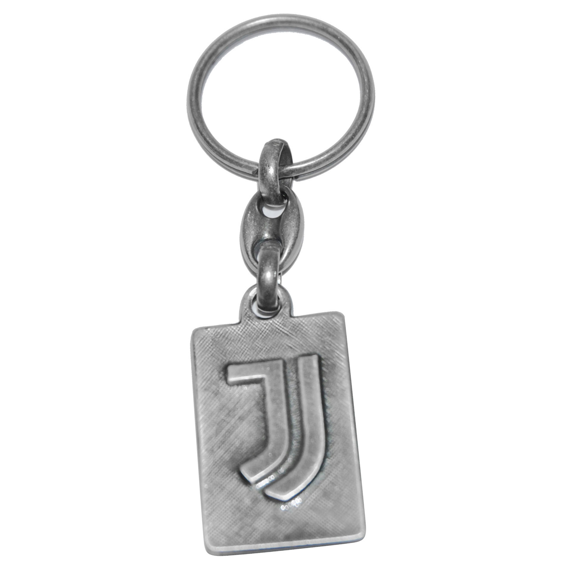 Portachiavi in metallo antichizzato con logo ufficiale Juventus FC in rilievo.