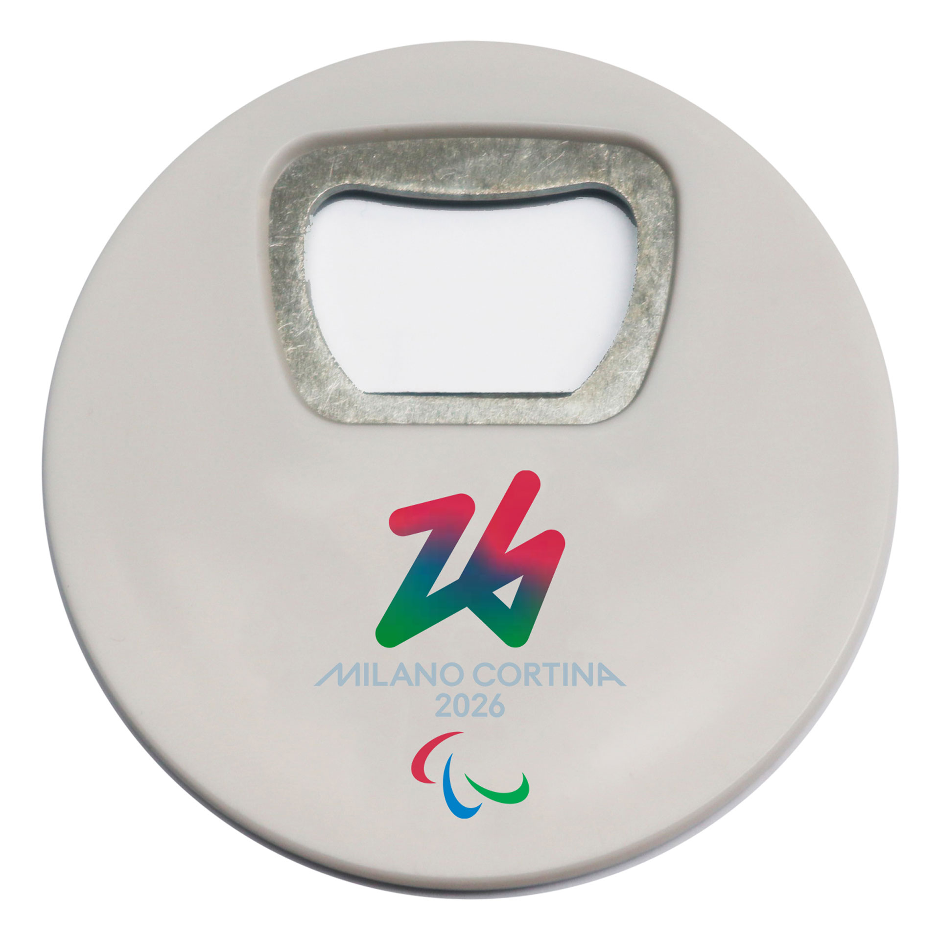 MAGNETE APRIBOTTIGLIE OLIMPIADI MILANO CORTINA 2026 IN ABS ROTONDO DIAMETRO 67 MM LOGO PARALYMPIC EMBLEMA COLORATO SU FONDO BIANCO CON MAGNETE SU RETRO