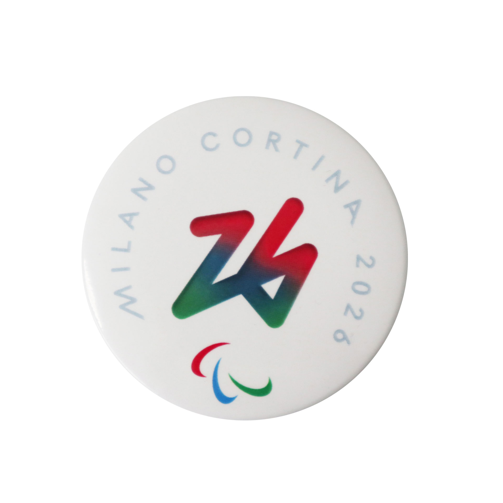 MAGNETE APRIBOTTIGLIE OLIMPIADI MILANO CORTINA 2026 IN METALLO ROTONDO STAMPATO DIAMETRO 55 MM LOGO PARALYMPIC EMBLEMA COLORATO SU FONDO BIANCO CON MAGNETE SU RETRO