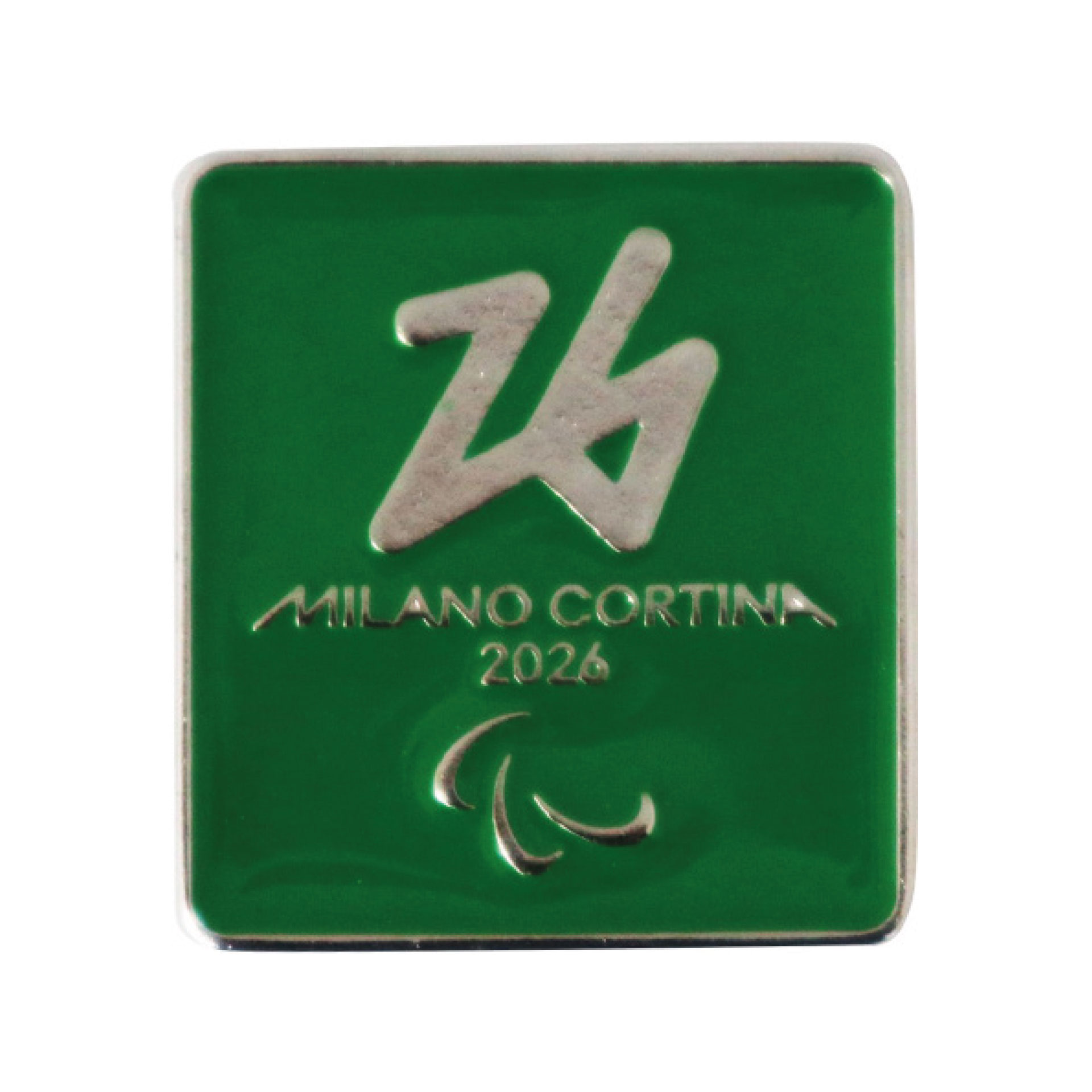 MAGNETE OLIMPIADI MILANO CORTINA 2026 IN METALLO SMALTATO RETTANGOLARE DIMENSIONI 40X36 MM LOGO PARALYMPIC EMBLEMA MONOCROMATICO SU FONDO VERDE LOGO METALLO FONDO SMALTO VERDE MADE IN ITALY