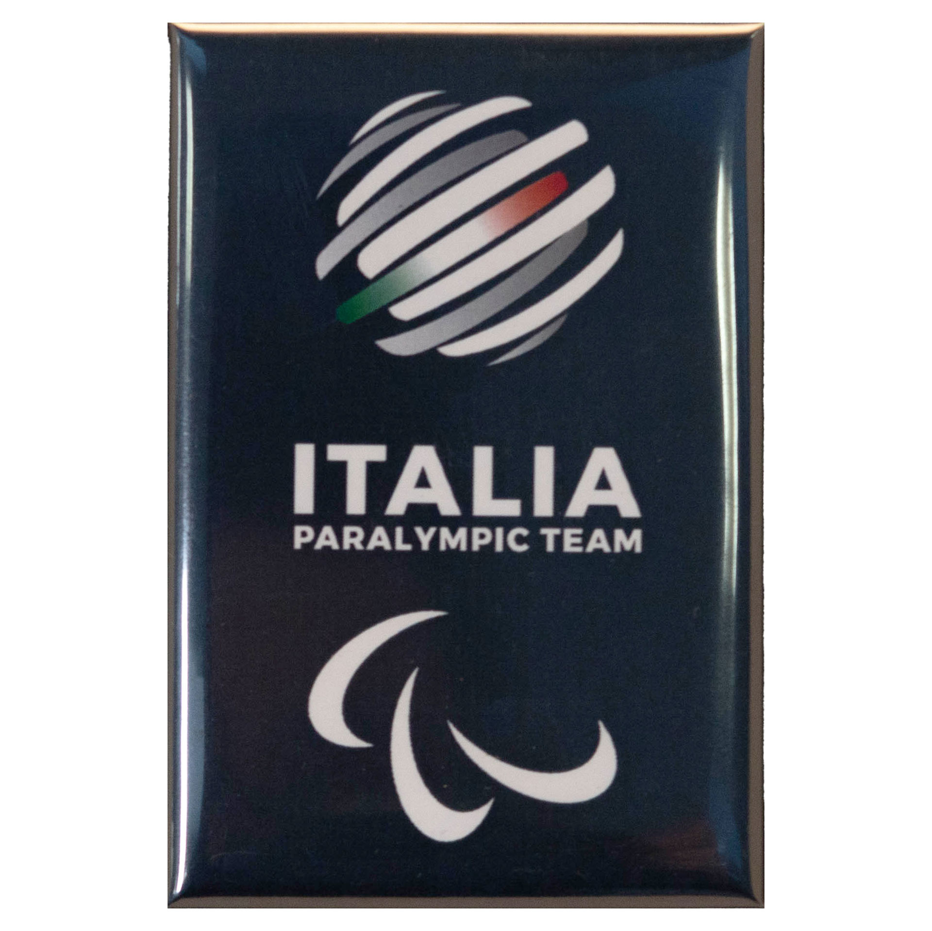 MAGNETE ITALIATEAM IN METALLO STAMPATO RETTANGOLARE DIMENSIONI 78X53 MM LOGO PARALYMPIC EMBLEMA E LOGO ITALIA PARLYMPIC TEAM BIANCHI SU FONDO BLU