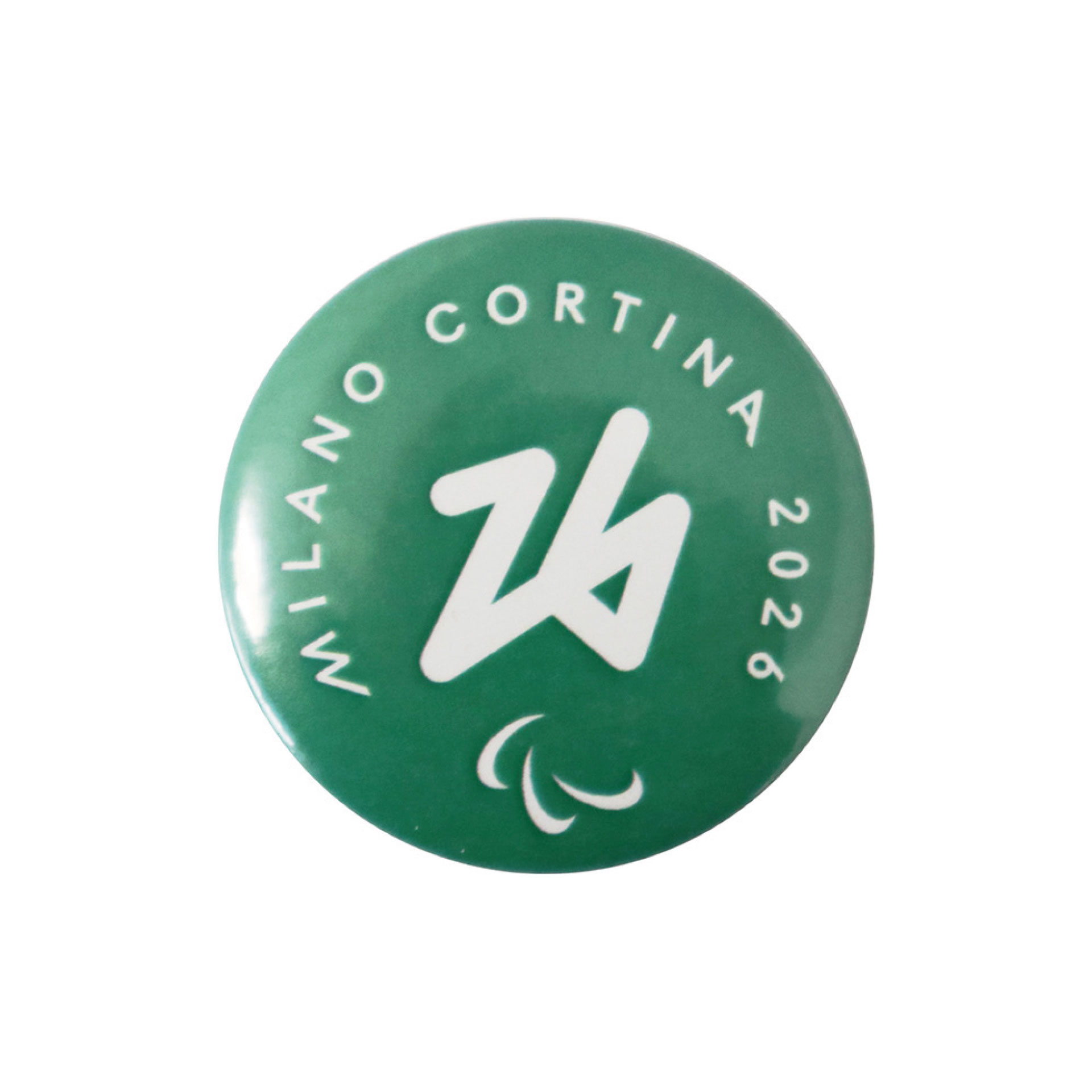 MAGNETE OLIMPIADI MILANO CORTINA 2026 IN METALLO STAMPATO ROTONDO DIAMETRO 50 MM LOGO PARALYMPIC EMBLEMA MONOCROMATICO SU FONDO VERDE