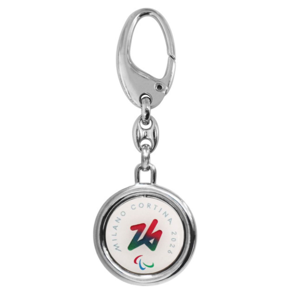 PORTACHIAVI OLIMPIADI MILANO CORTINA 2026 IN METALLO STAMPATO LOGO PARALYMPIC MASCOT MILO COLORATO SU FONDO AZZURRO PORTACHIAVI GIREVOLE CON LOGO STAMPATO FRONTE E RETRO