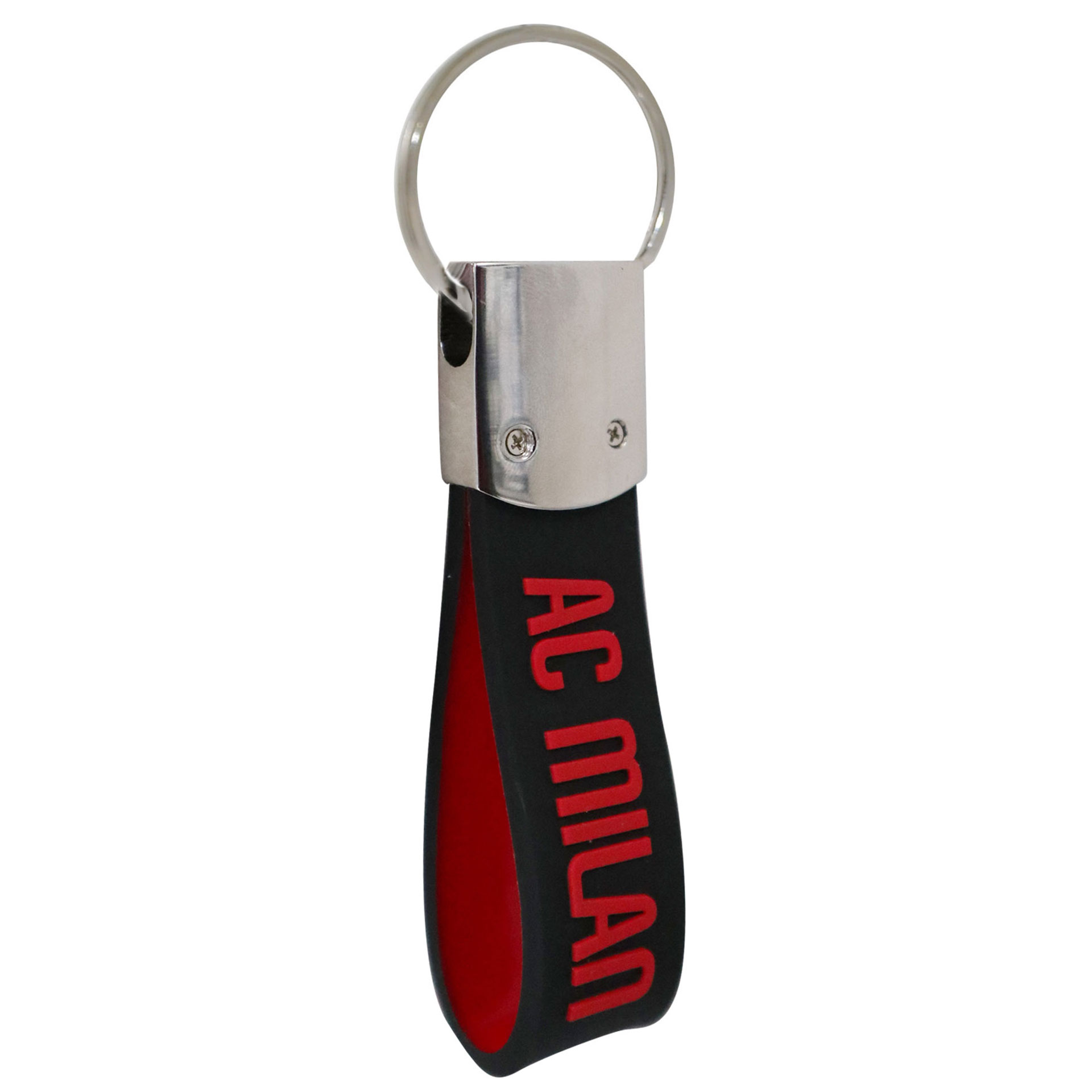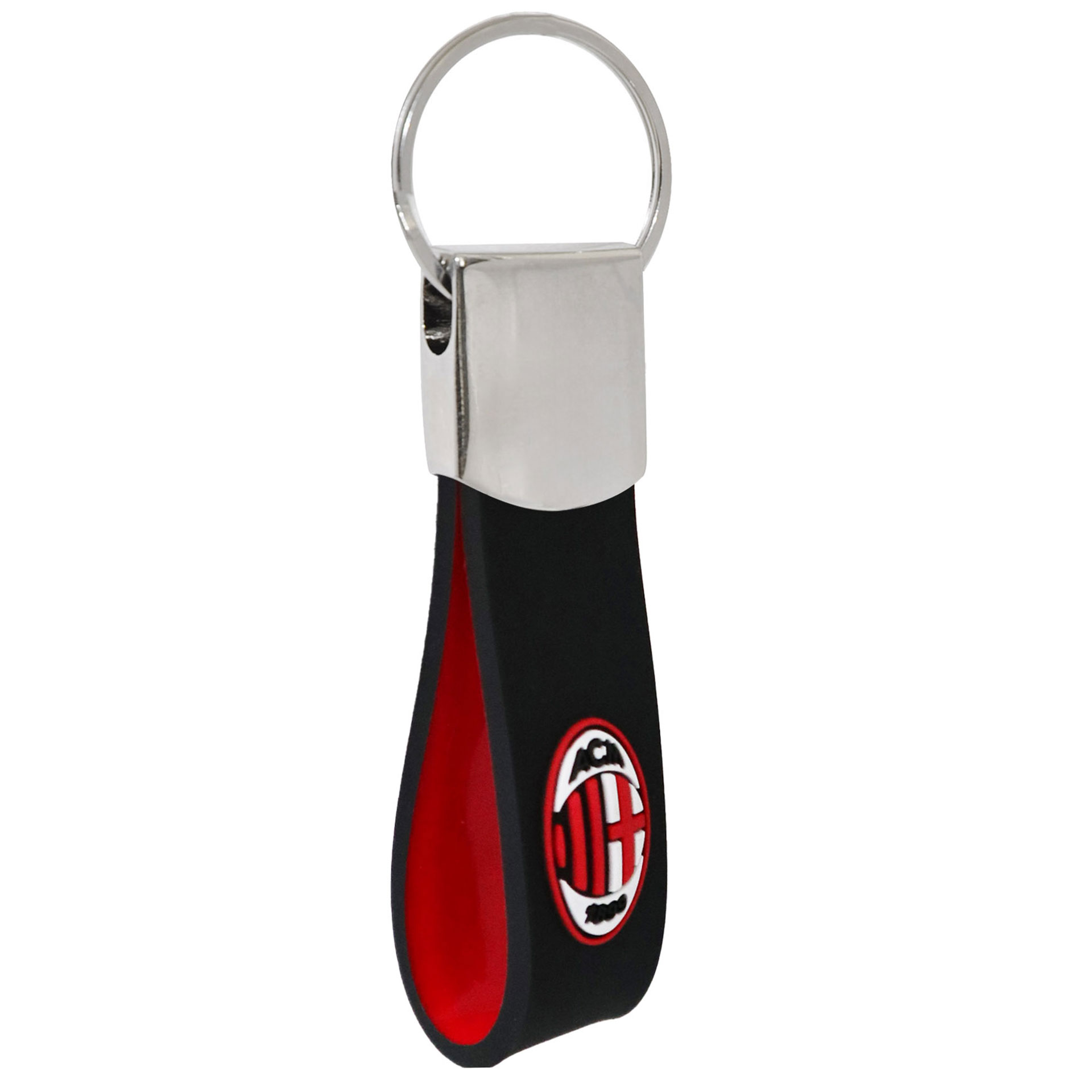 Portachiavi in gomma con logo e scritta ufficiali AC Milan in rilievo.
