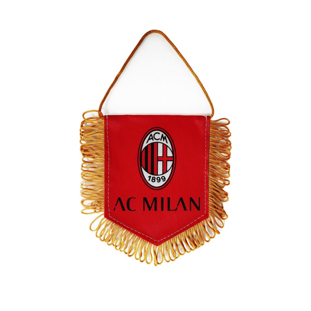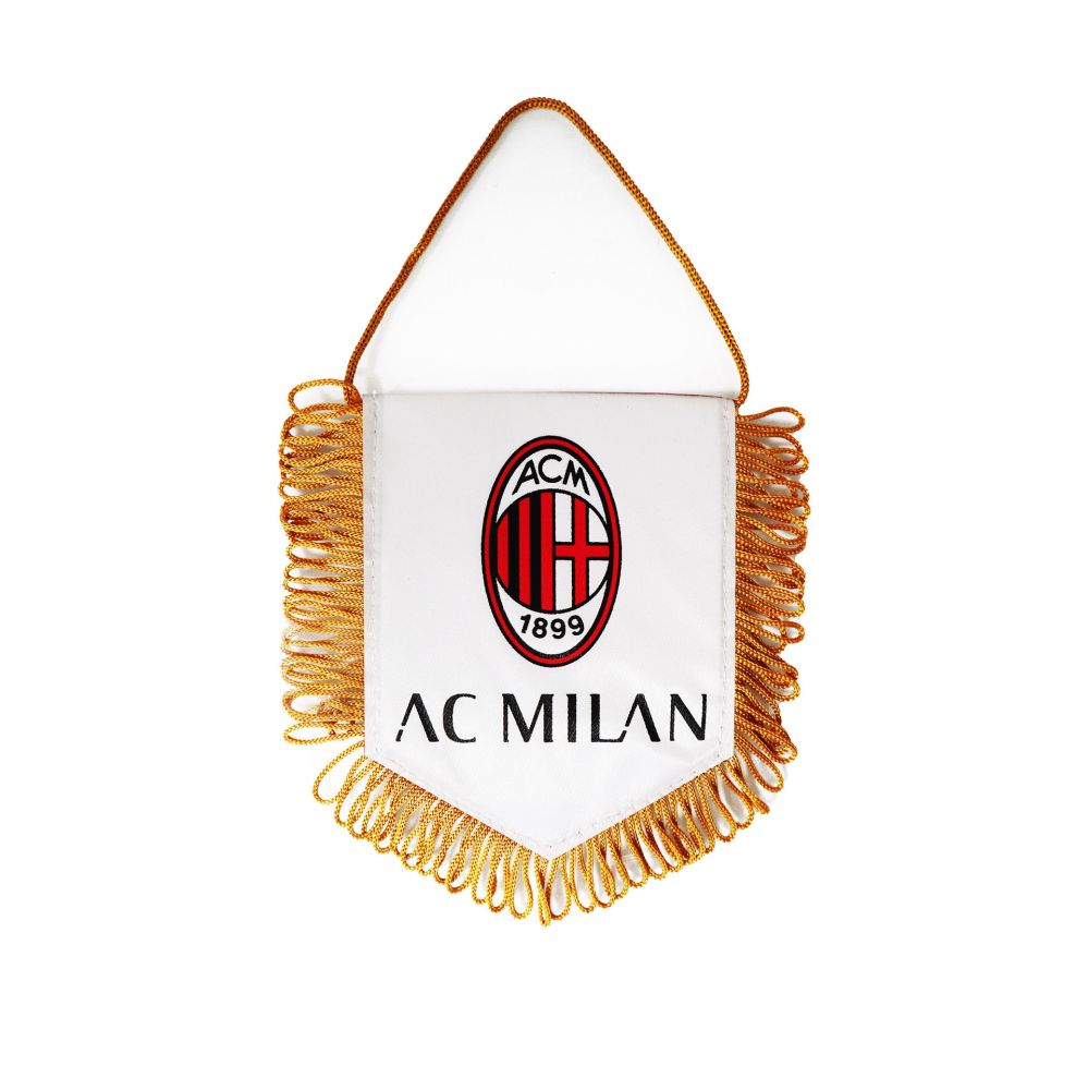 Gagliardetto triangolare bifacciale bianco e rosso con frange dorate con logo ufficiale AC Milan.