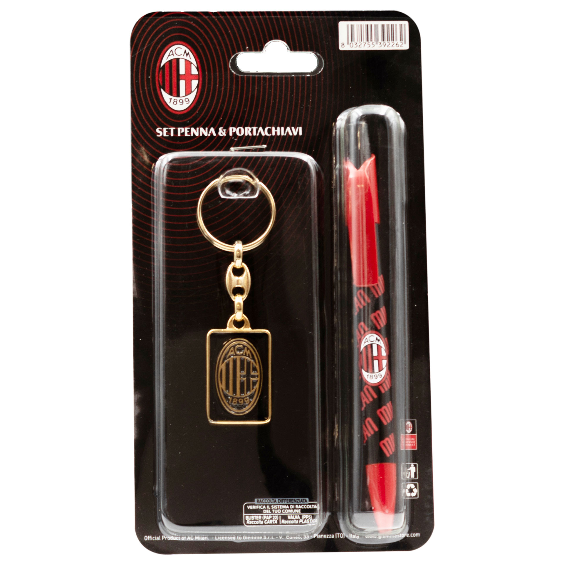 Set penna e portachiavi in metallo nero con logo ufficiale AC Milan smaltato a mano.