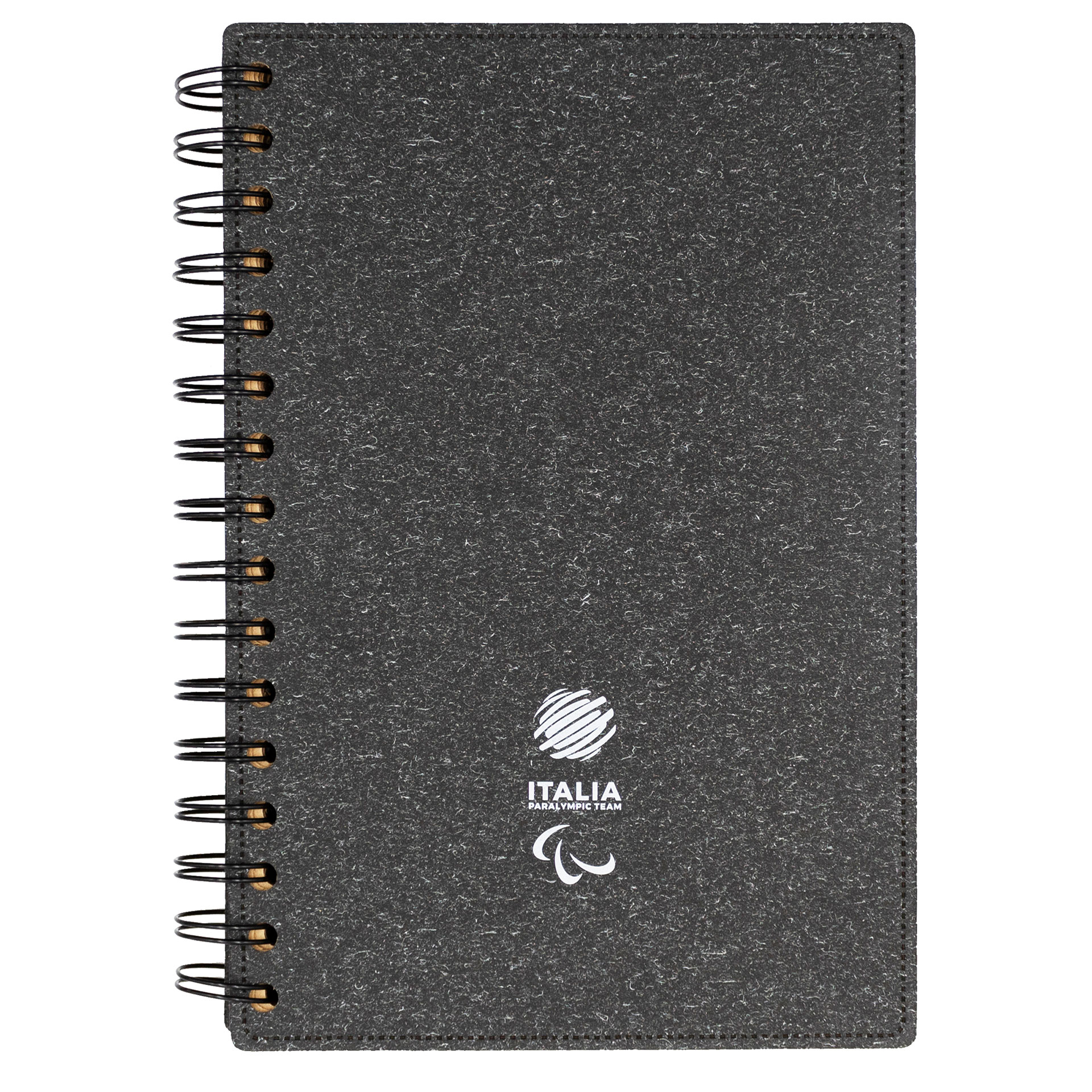 "NOTEBOOK WIRE-O ITALIATEAM COPERTINA RIGIDA IN CARTONE RICICLATO, INCLUDE 160PAGINE A RIGHE SU CARTA RICICLATA MARRONE, FORMATO A5, 65GRAMMI PER METRO QUADRO, LOGO ""MATERIALE RICICLATO"" PRESTAMPATO SULLE PAGINE, LOGHI PARALYMPIC EMBLEMA E ITALIA PARALYMPIC TEAM MONOCROMATICI BIANCHI"
