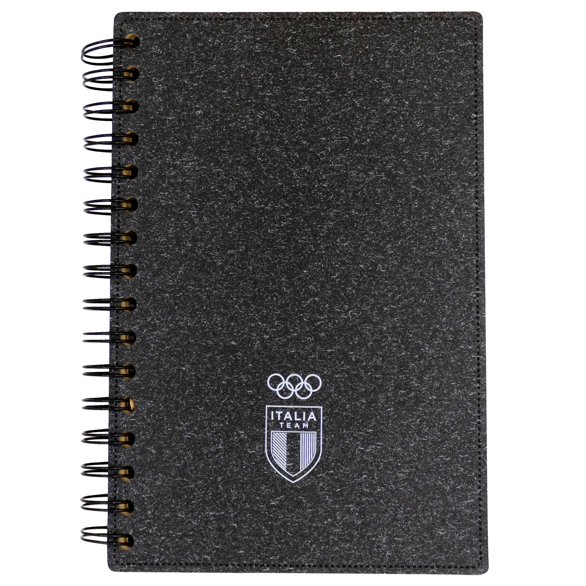 "NOTEBOOK WIRE-O ITALIATEAM COPERTINA RIGIDA IN CARTONE RICICLATO, INCLUDE 160PAGINE A RIGHE SU CARTA RICICLATA MARRONE, FORMATO A5, 65GRAMMI PER METRO QUADRO, LOGO ""MATERIALE RICICLATO"" PRESTAMPATO SULLE PAGINE, LOGHI OLYMPIC EMBLEMA E SCUDO ITALIA TEAM MONOCROMATICI BIANCHI"
