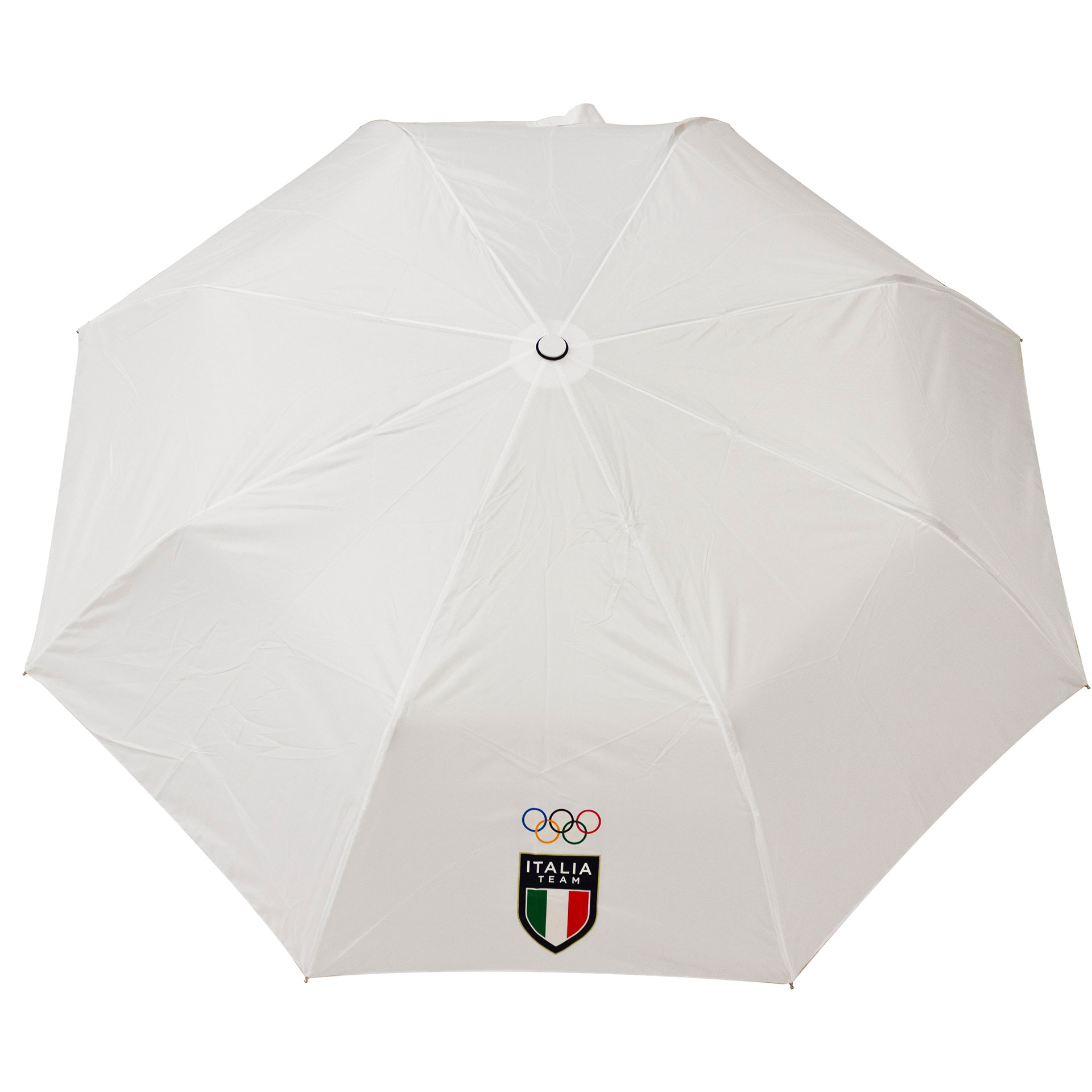 OMBRELLO ITALIATEAM AUTOMATICO TASCABILE BIANCO DIAMETRO 96CM LUNGEZZA 30-52CM STECCA IN METALLO 3 PARTI, RAGGI E PUNTE IN METALLO, MANICO GOMMATO, RIVESTIMENTO E CUSTODIA IN POLIESTERE-PONGEE LOGHI OLYMPIC EMBLEMAE SCUDO ITALIA TEAM COLORATI
