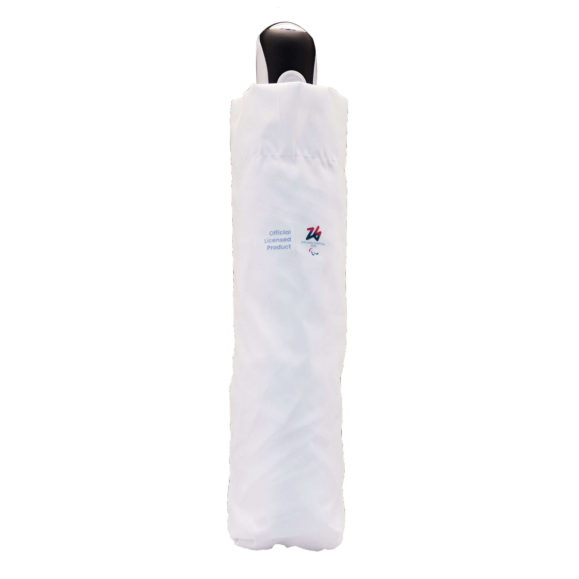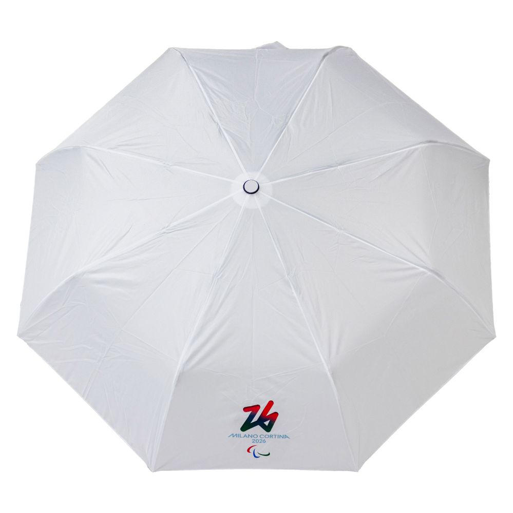 OMBRELLO OLIMPIADI MILANO CORTINA 2026 TASCABILE BIANCO DIAMETRO 96CM LUNGEZZA 30-52CM STECCA IN METALLO 3 PARTI, RAGGI E PUNTE IN METALLO, MANICO GOMMATO, RIVESTIMENTO E CUSTODIA IN POLIESTERE-PONGEE LOGHI PARALYMPIC EMBLEMA COLORATO