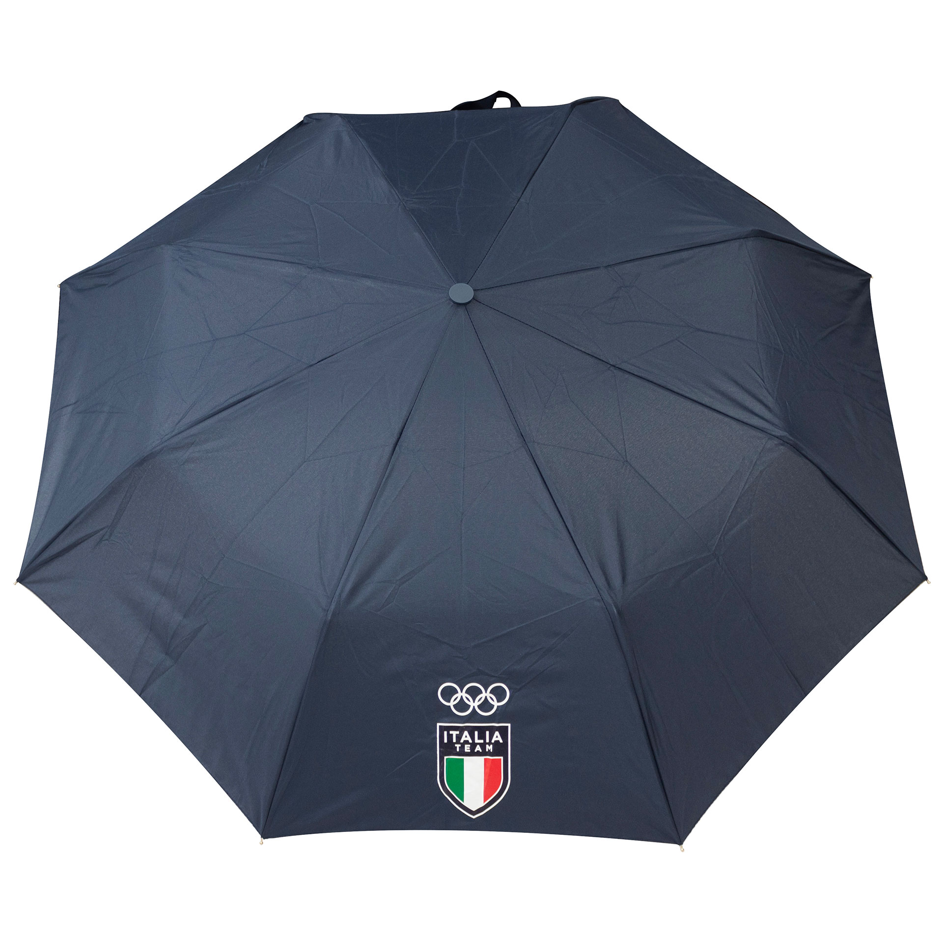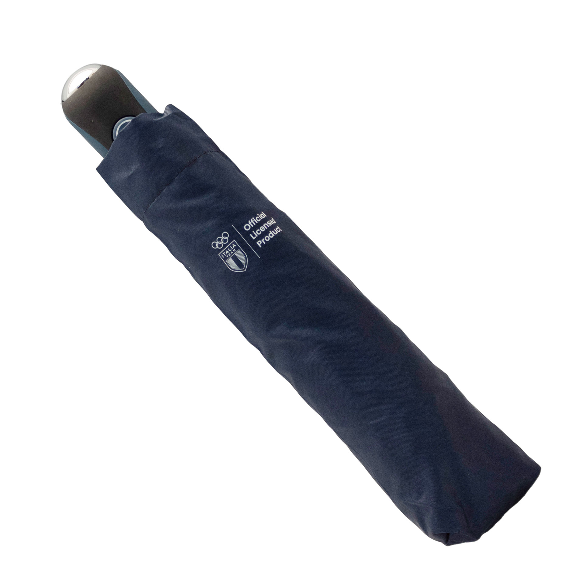 OMBRELLO ITALIATEAM AUTOMATICO TASCABILE BLU SCURO DIAMETRO 96CM LUNGEZZA 30-52CM STECCA IN METALLO 3 PARTI, RAGGI E PUNTE IN METALLO, MANICO GOMMATO, RIVESTIMENTO E CUSTODIA IN POLIESTERE-PONGEE LOGHI OLYMPIC EMBLEMA BIANCO E SCUDO ITALIA TEAM BIANCO+TRICOLORE
