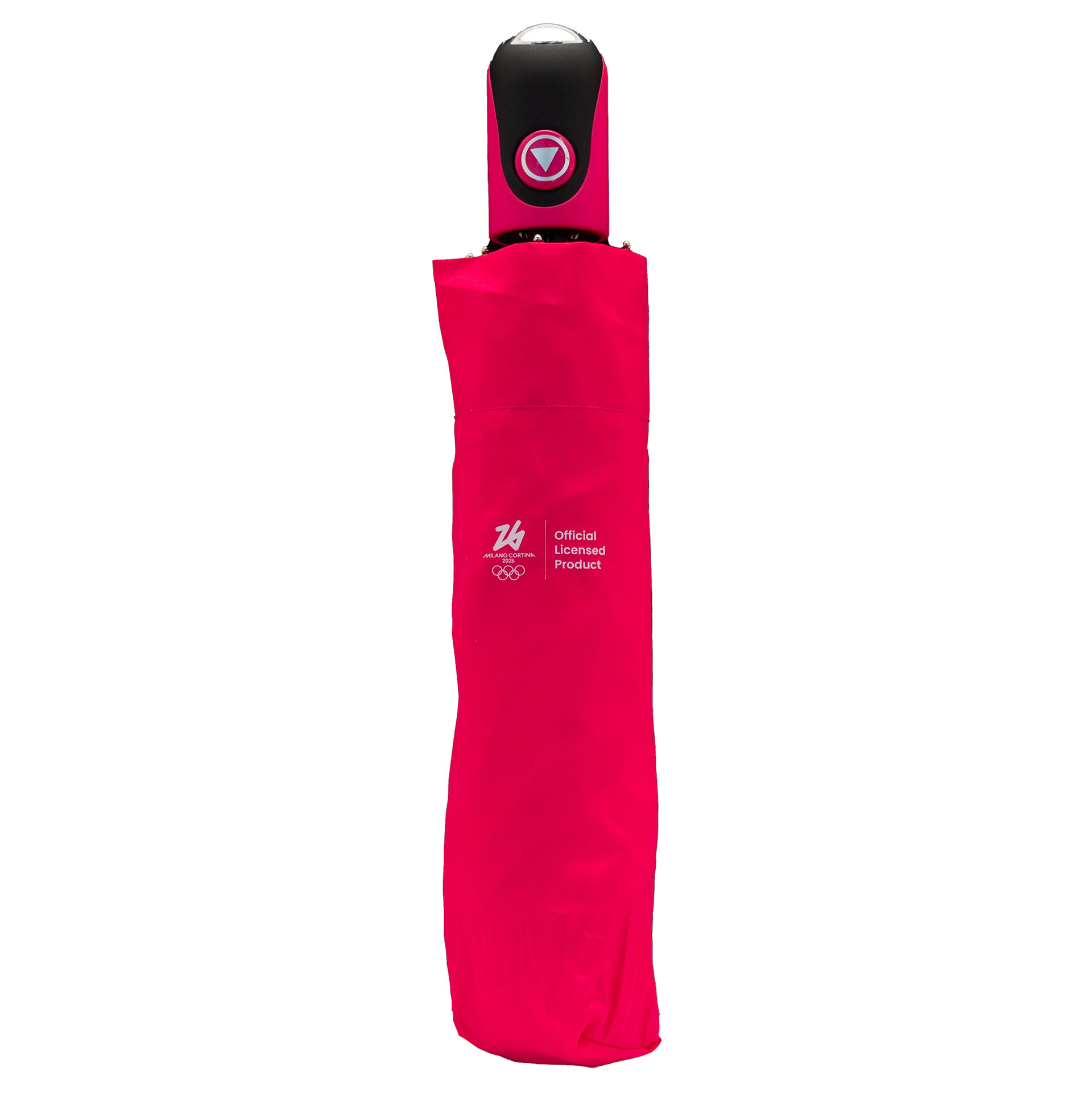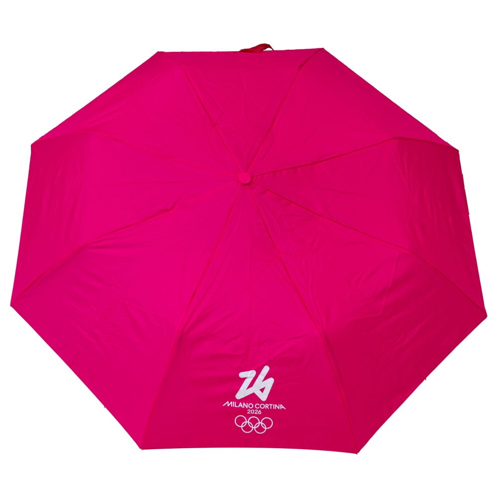 OMBRELLO OLIMPIADI MILANO CORTINA 2026 AUTOMATICO TASCABILE ROSA SCURO DIAMETRO 96CM LUNGEZZA 30-52CM STECCA IN METALLO 3 PARTI, RAGGI E PUNTE IN METALLO, MANICO GOMMATO, RIVESTIMENTO E CUSTODIA IN POLIESTERE-PONGEE LOGO OLYMPIC EMBLEMA 5 CERCHI MONOCROMATICO BIANCO
