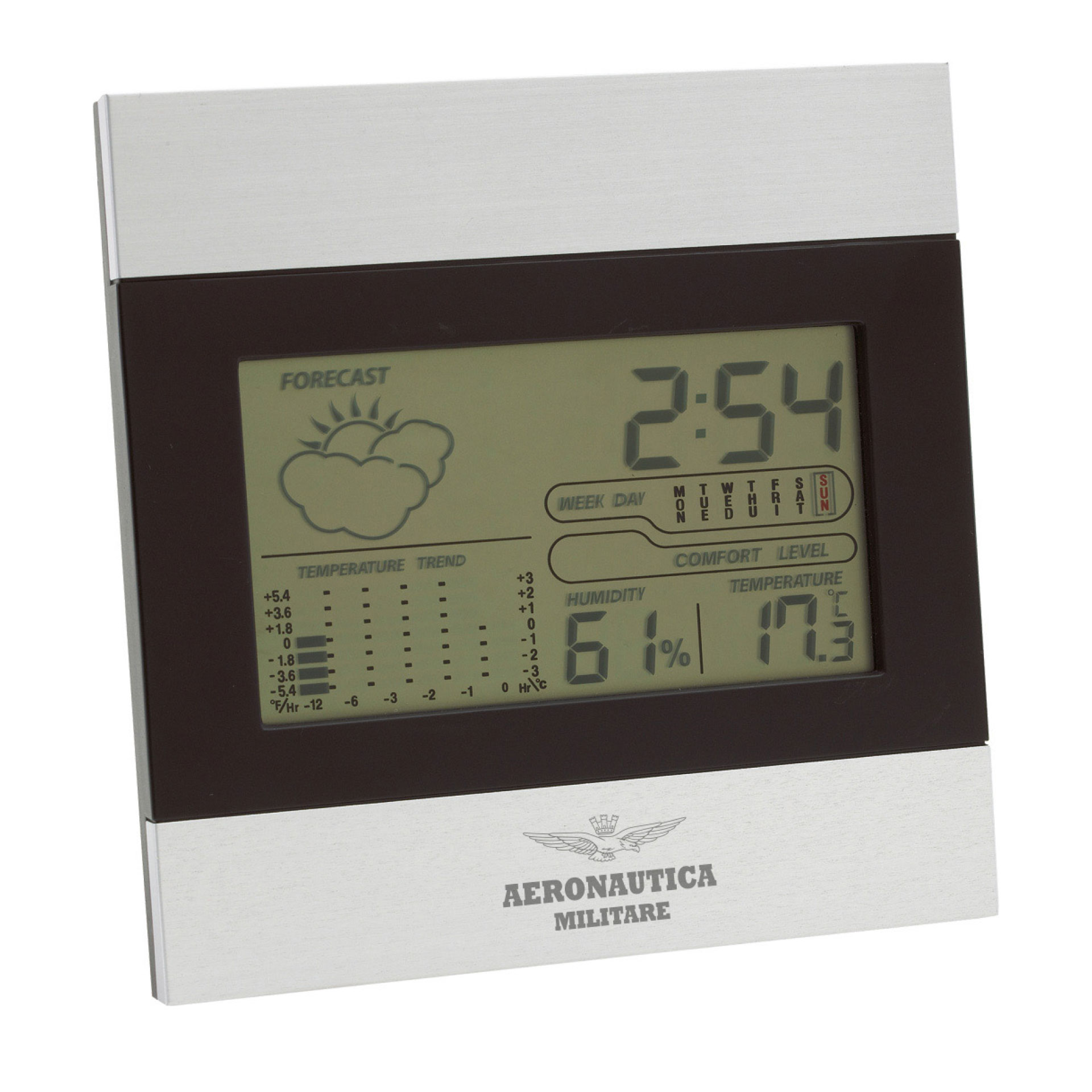 Stazione meteo SHINY DAY: display LCD, frontalino in alluminio, funzione allarme, indicazione del giorno, termometro, piedino da appoggio sul retro.