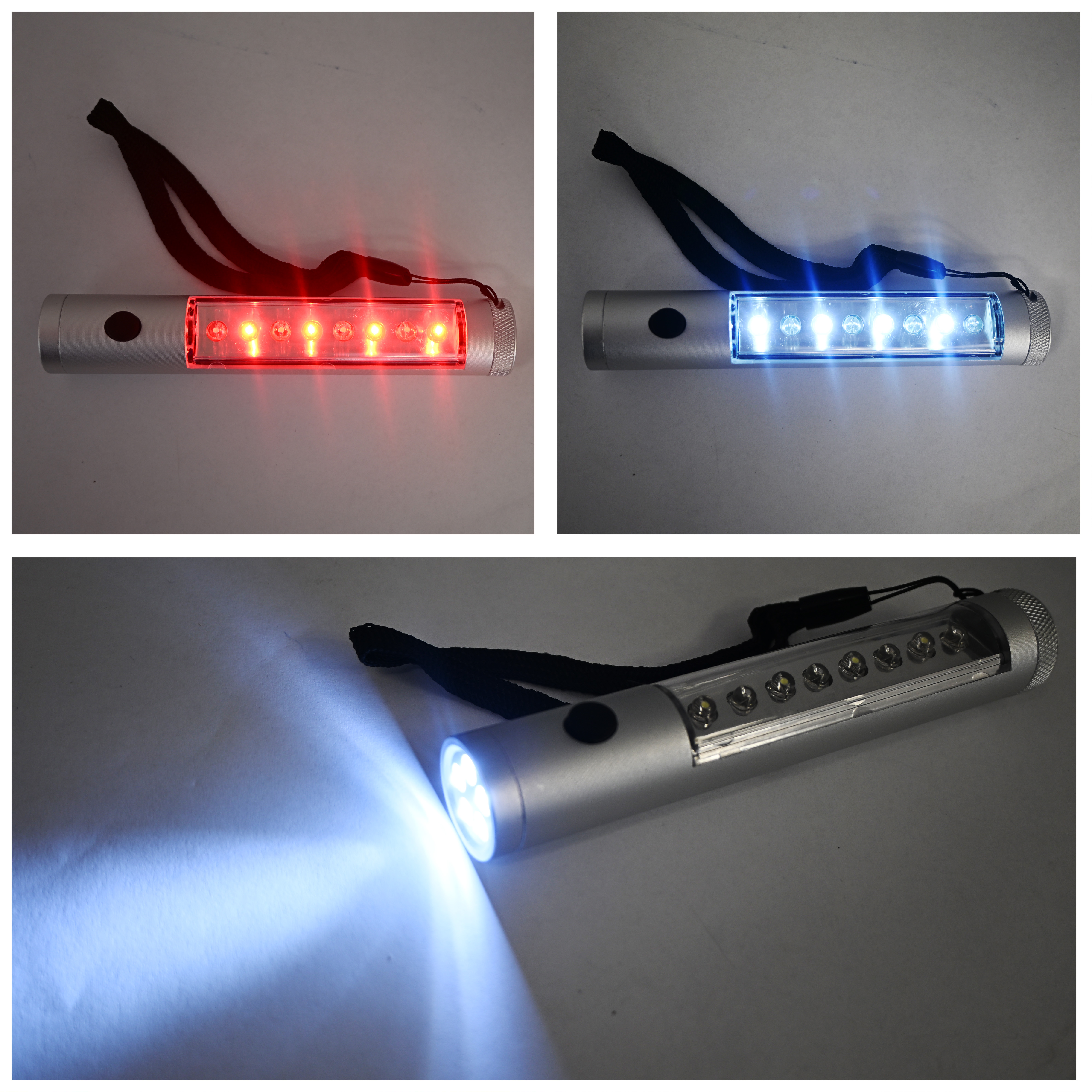 Torcia LED FLASH: punta 7 luci led bianchi e 3 rossi, lato 18 luci led bianchi e 6 rossi, 3 funzioni di illuminazione, magnete sull’estremità, struttura leggera e robusta in alluminio, laccetto nero in nylon. (batterie 3 x AAA escluse).