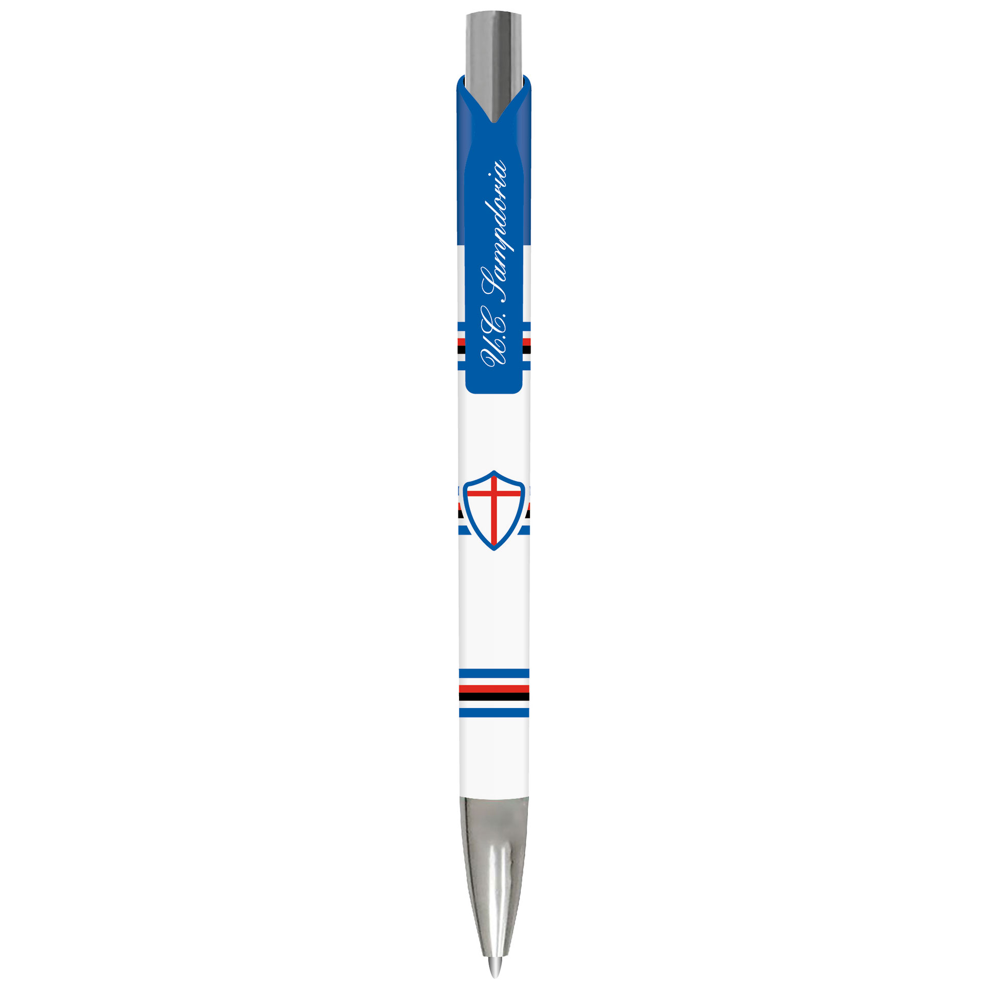 PENNA CON PULSANTE E PUNTALE CROMATI LOGO SCUDO CON RIGHE SAMPDORIA