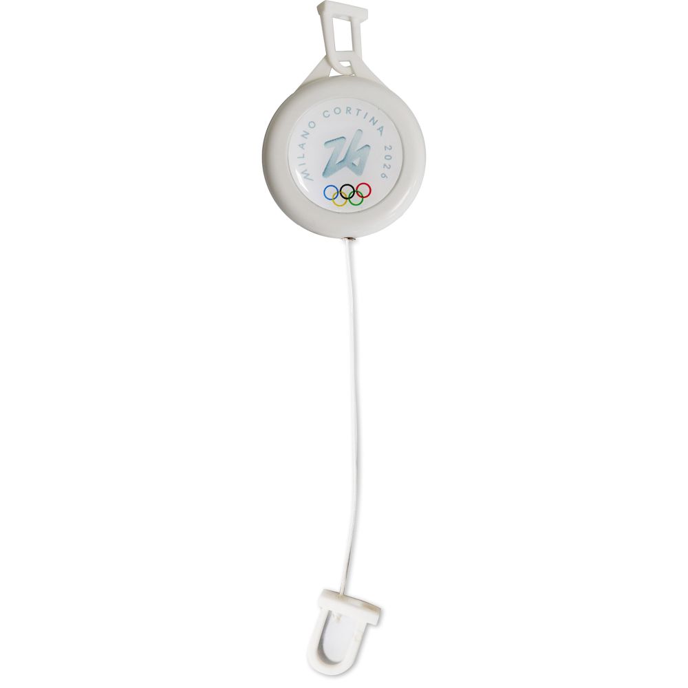 PORTA SKIPASS OLIMPIADI MILANO CORTINA 2026 IN ABS BIANCO CON CLIP DIAMENTRO 4,6 CM LOGO OLYMPIC MASCOT TINA 5 CERCHI SU FONDO BLU