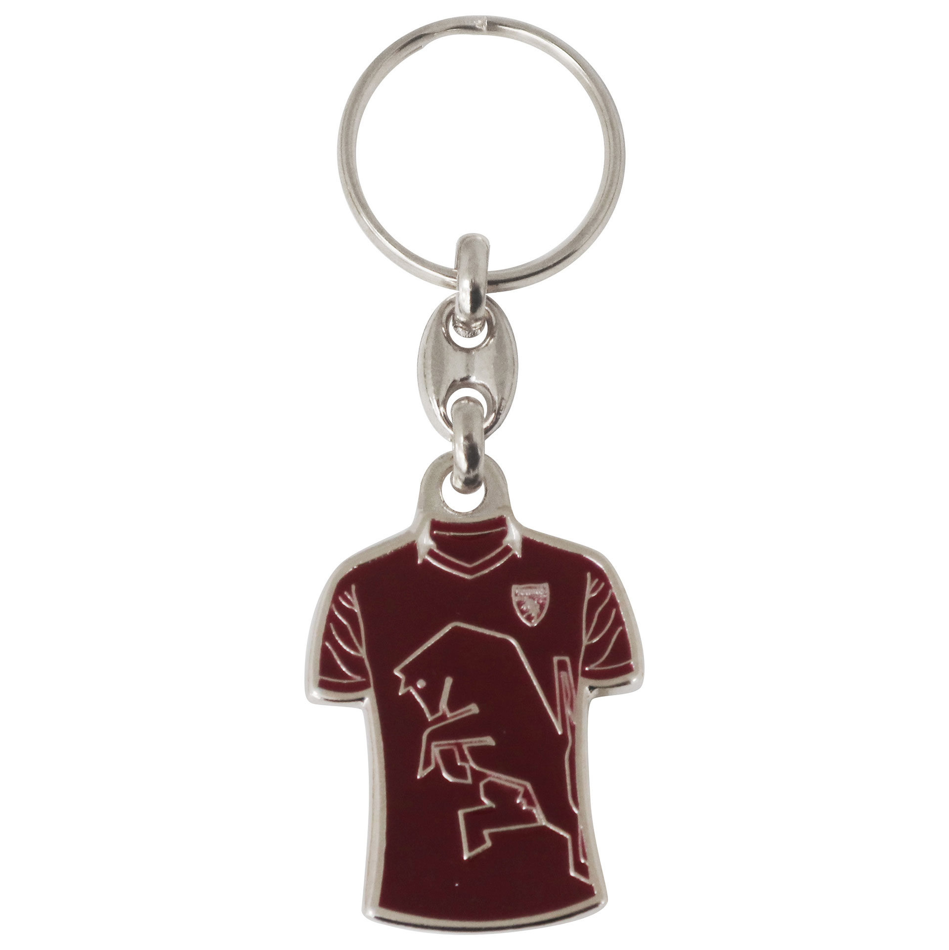Portachiavi in metallo dorato con maglietta granata e logo ufficiale Torino FC smaltati a mano.