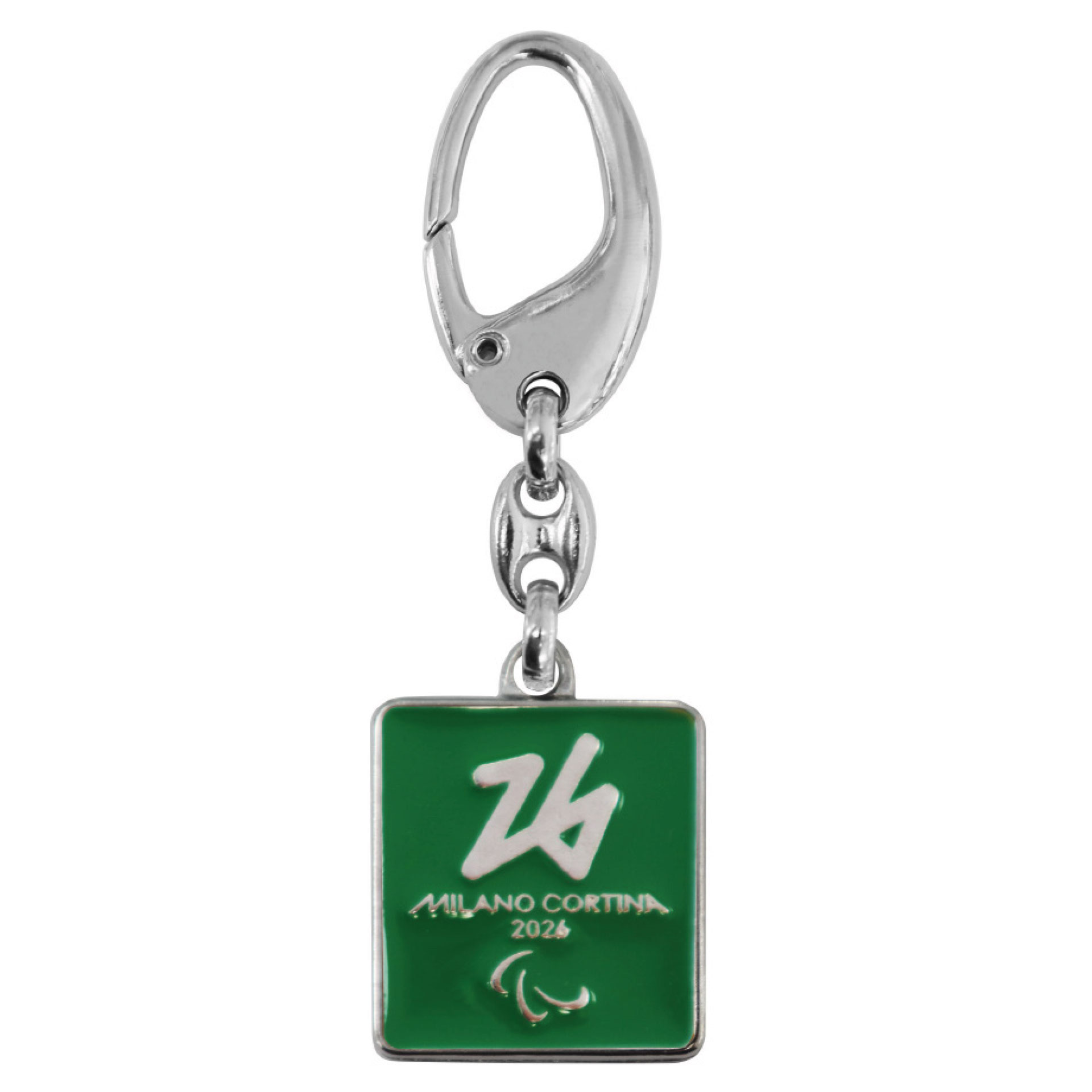 PORTACHIAVI OLIMPIADI MILANO CORTINA 2026 IN METALLO SMALTATO RETTANGOLARE LOGO PARALYMPIC EMBLEMA MONOCROMATICO SU FONDO VERDE