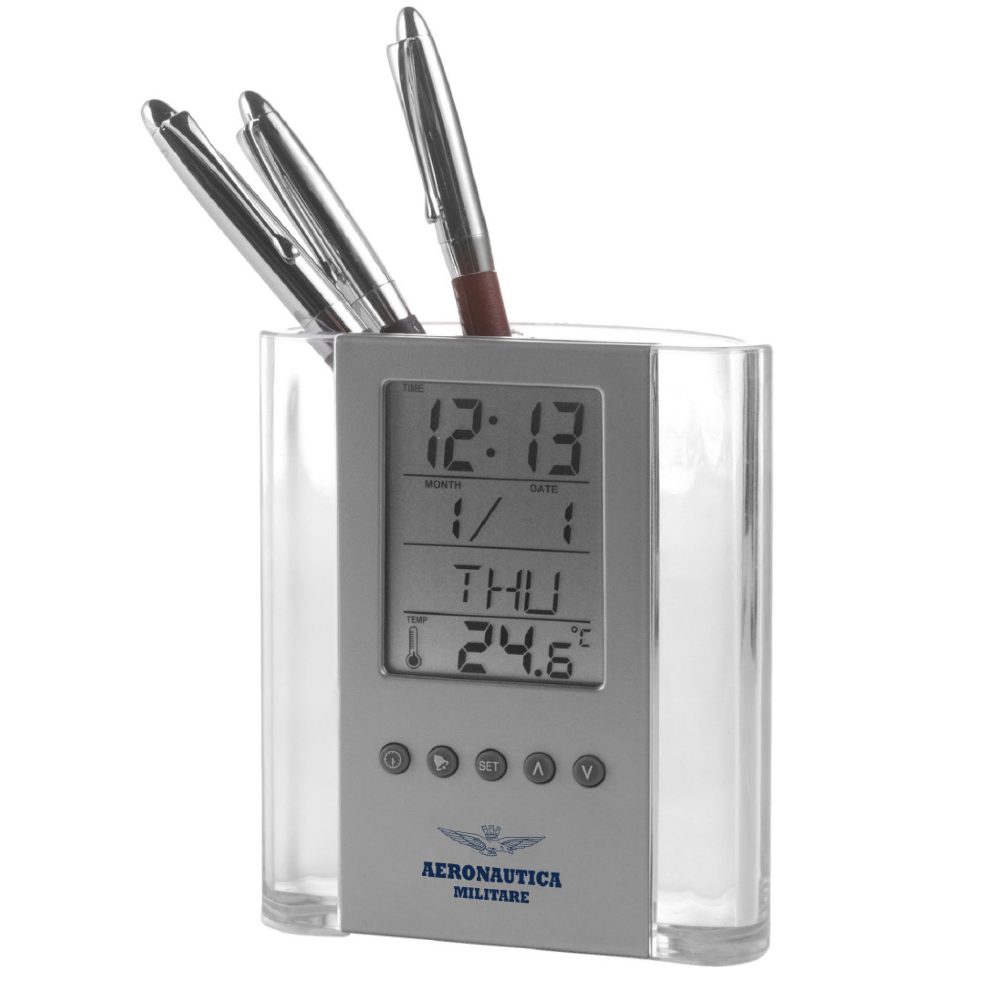 PORTAPENNE DA TAVOLO CON OROLOGIO, FUNZIONE SVEGLIA, CALENDARIO E TERMOMETRO, BATTERIE INCLUSE DIMENSIONE 10,5 X 5,5 X 12,8 CM