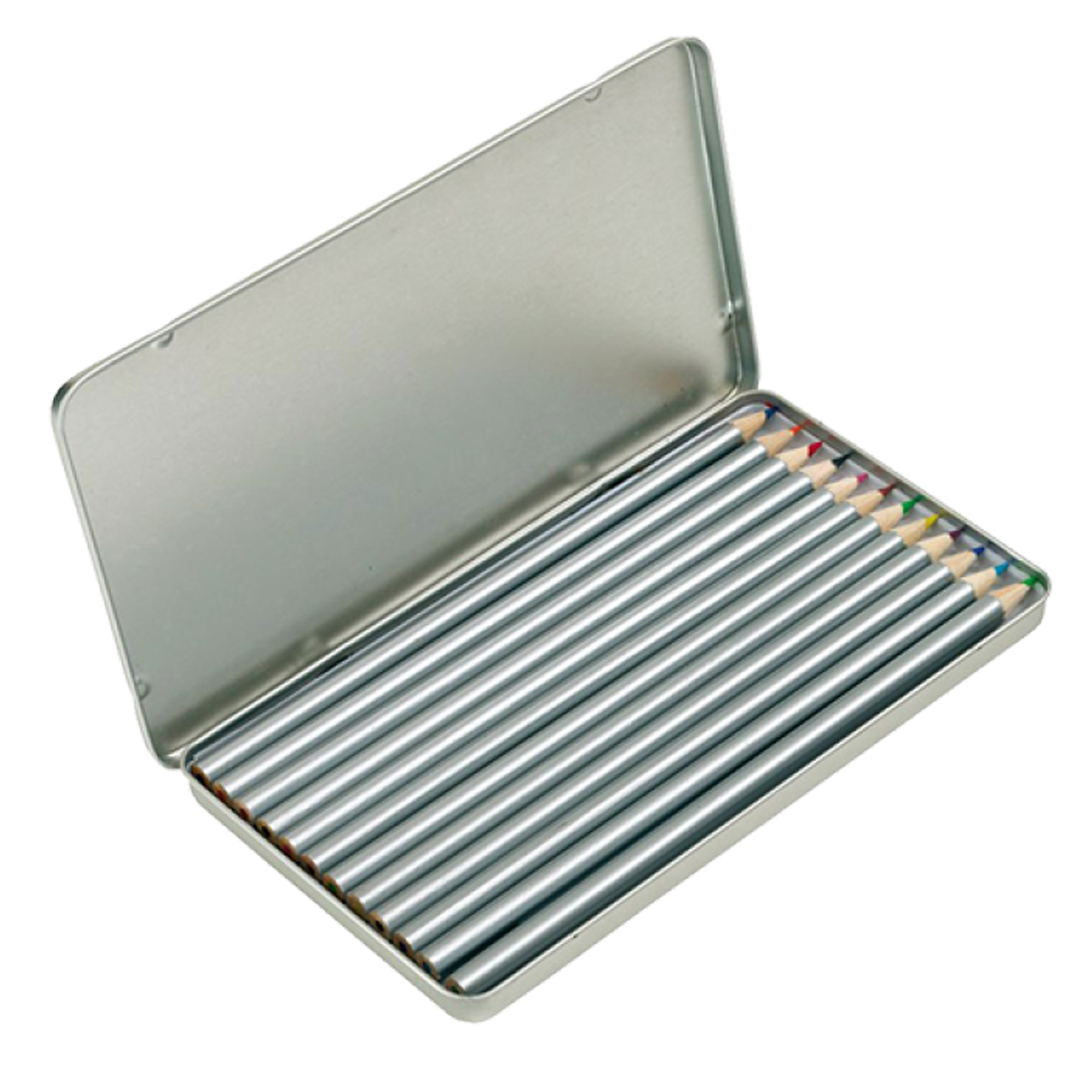 MATITE COLORATE LUNGHE, 12 PZ, VERNICIATE IN ARGENTO, GIA' TEMPERATA, IN CONFEZIONE DI METALLO RETTANGOLARE INTER. DIMENSIONE: 18.5X10.2X1 CM