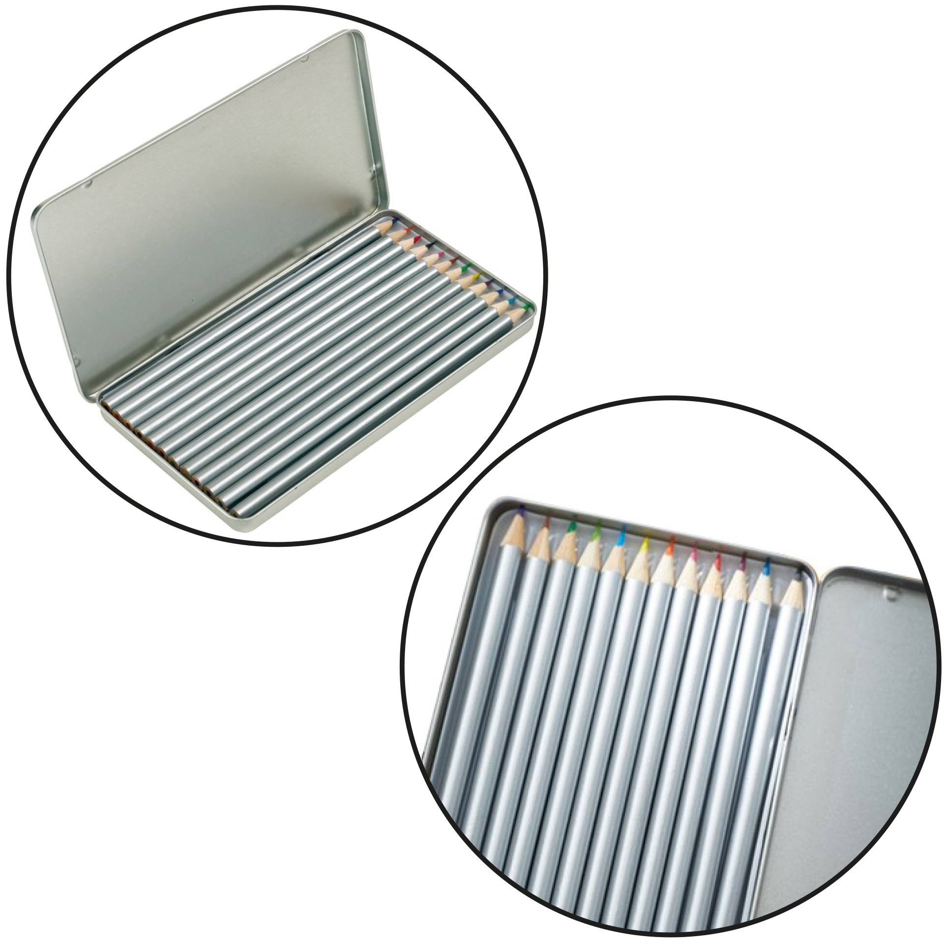 MATITE COLORATE LUNGHE, 12 PZ, VERNICIATE IN ARGENTO, GIA' TEMPERATA, IN CONFEZIONE DI METALLO RETTANGOLARE MILAN. DIMENSIONE: 18.5X10.2X1 CM