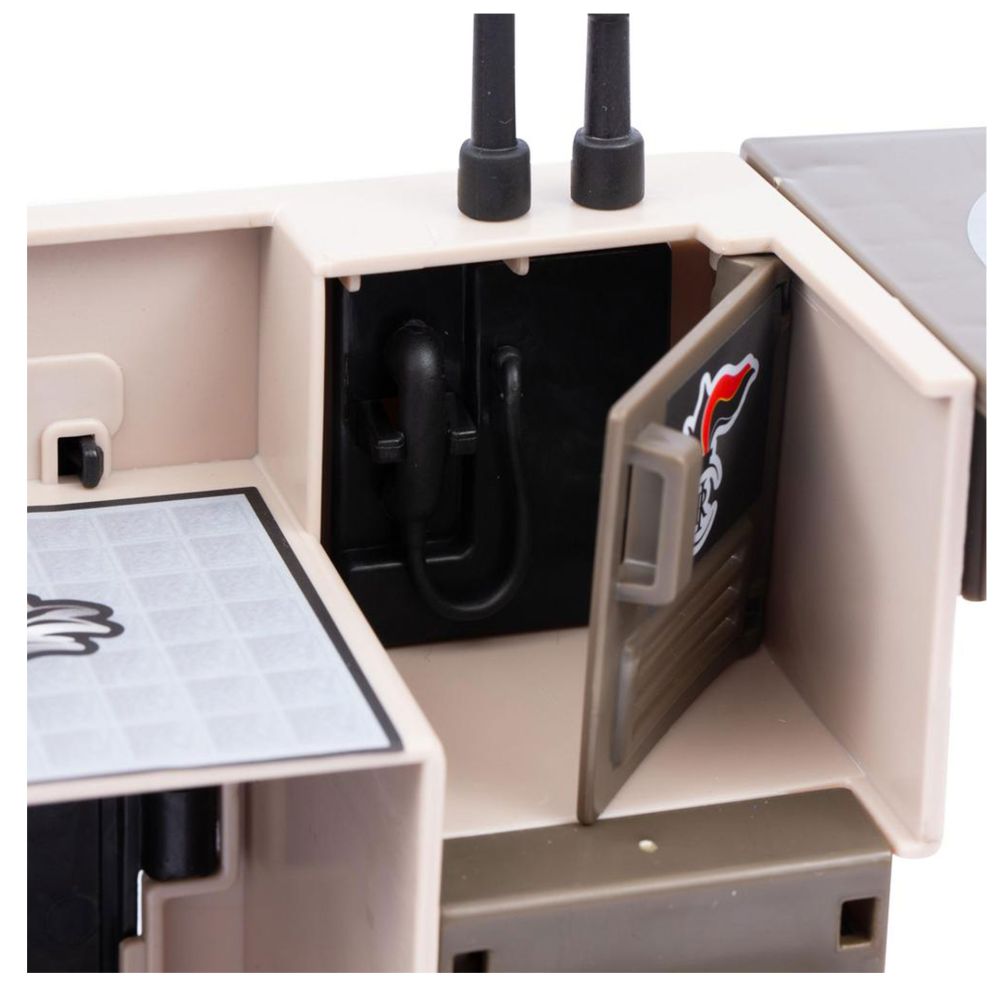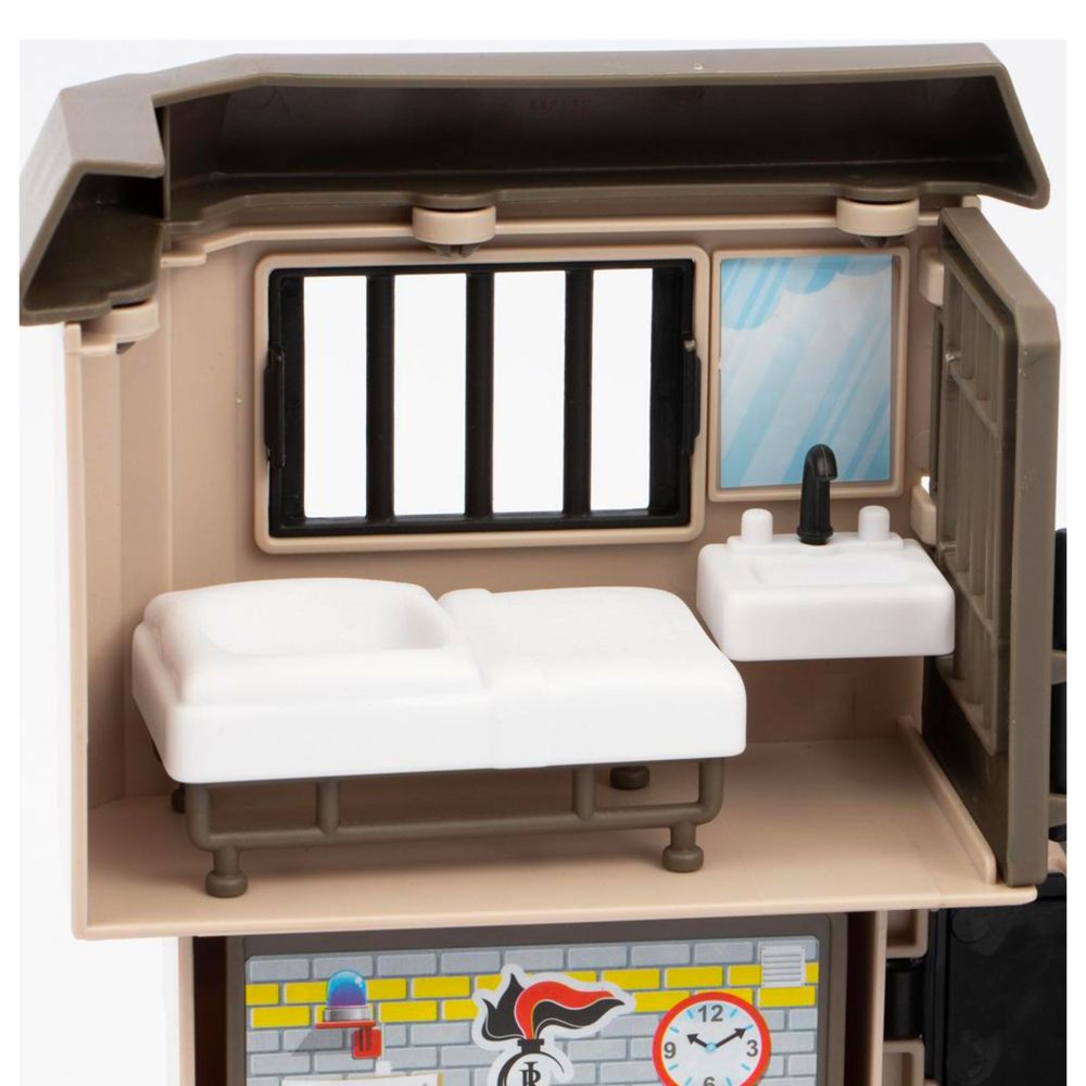 STAZIONE OPERATIVA CON DUE PIANI E GIOCABILITA' SULLA PARTE ANTERIORE E POSTERIORE, SCALA PER RAGGIUNGERE I DUE LIVELLI, PORTA APRIBILE E CELLA, ALL'INTERNO DELLA CONFEZIONE PERSONAGGIO ARTICOLATO ALTO 7 CM CON ACCESSORI