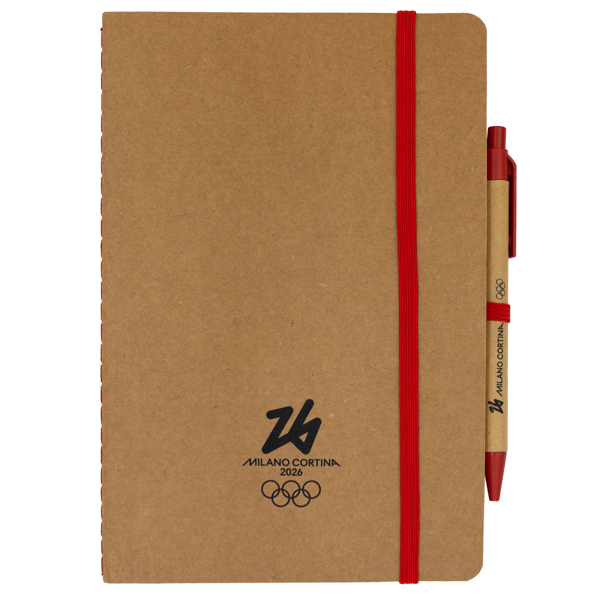 TACCUINO OLIMPIADI MILANO CORTINA 2026 IN CARTONE RICICLATO, FORMATO A5, 120 PAG. BIANCHE, ELSATICO E PASSANTE ROSSI, CON PENNA A SFERA CON CORPO IN CARTONE, DETTAGLI IN PAGLIA DI GRANA REFILL BLU, LOGHI OLYMPIC EMBLEMA 5 CERCHI MONOCROMATICI NERI