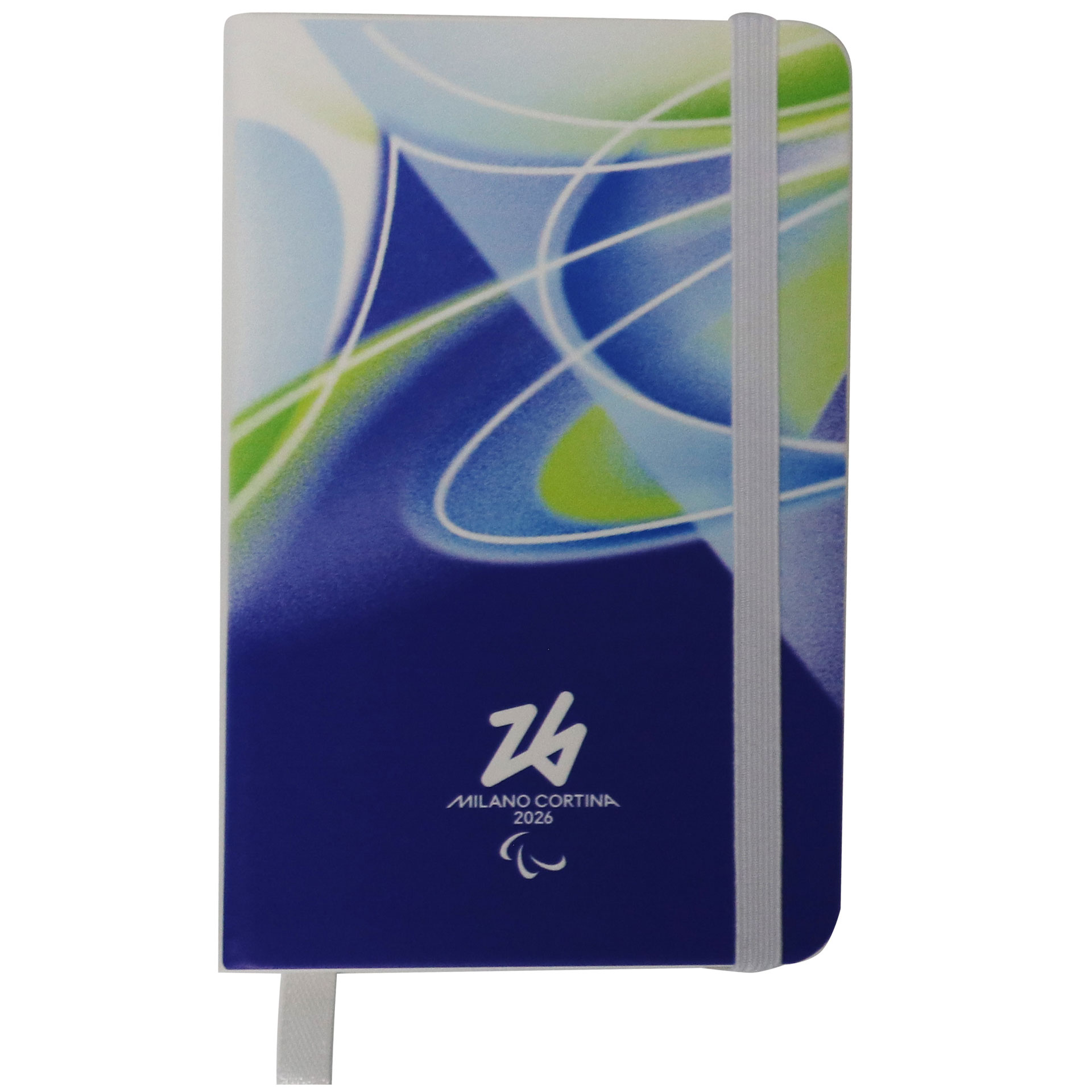 TACCUINO IN PU BIANCO, 96 PAGINE A RIGHE, ELSATICO E SEGNALIBRO IN TINTA, STAMPA PARALYMPIC LOOK VERDE SU FONDO BLU