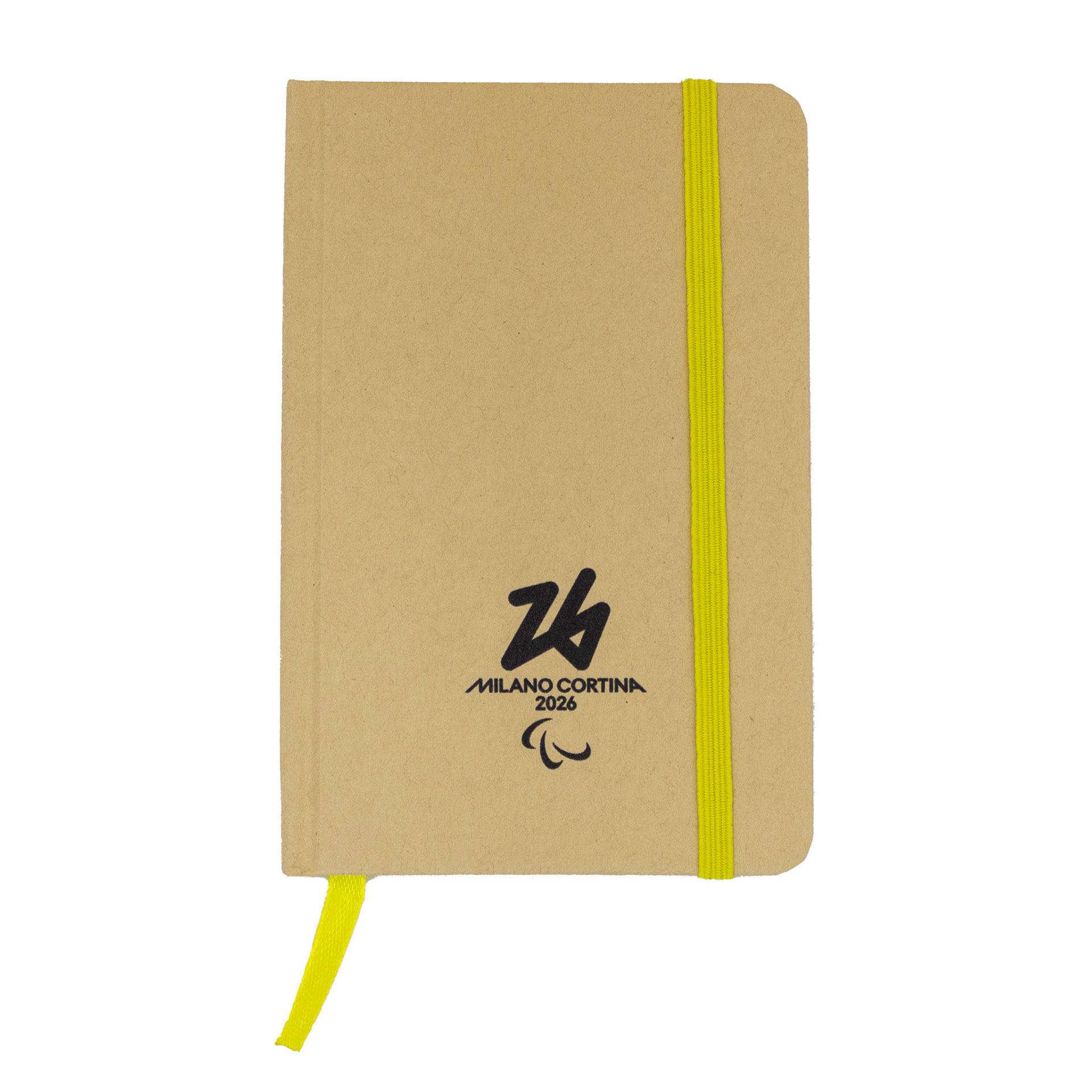TACCUINO OLIMPIADI MILANO CORTINA 2026 IN CARTA RICICLATA, FORMATO A6, 160 PAG. A RIGHE, ELSATICO E SEGNALIBRO GIALLO, LOGO MATERIALE RICICLATO PRESTAMPATO SULLE PAG., LOGO PARALYMPIC EMBLEMA MONOCROMATICO NERO